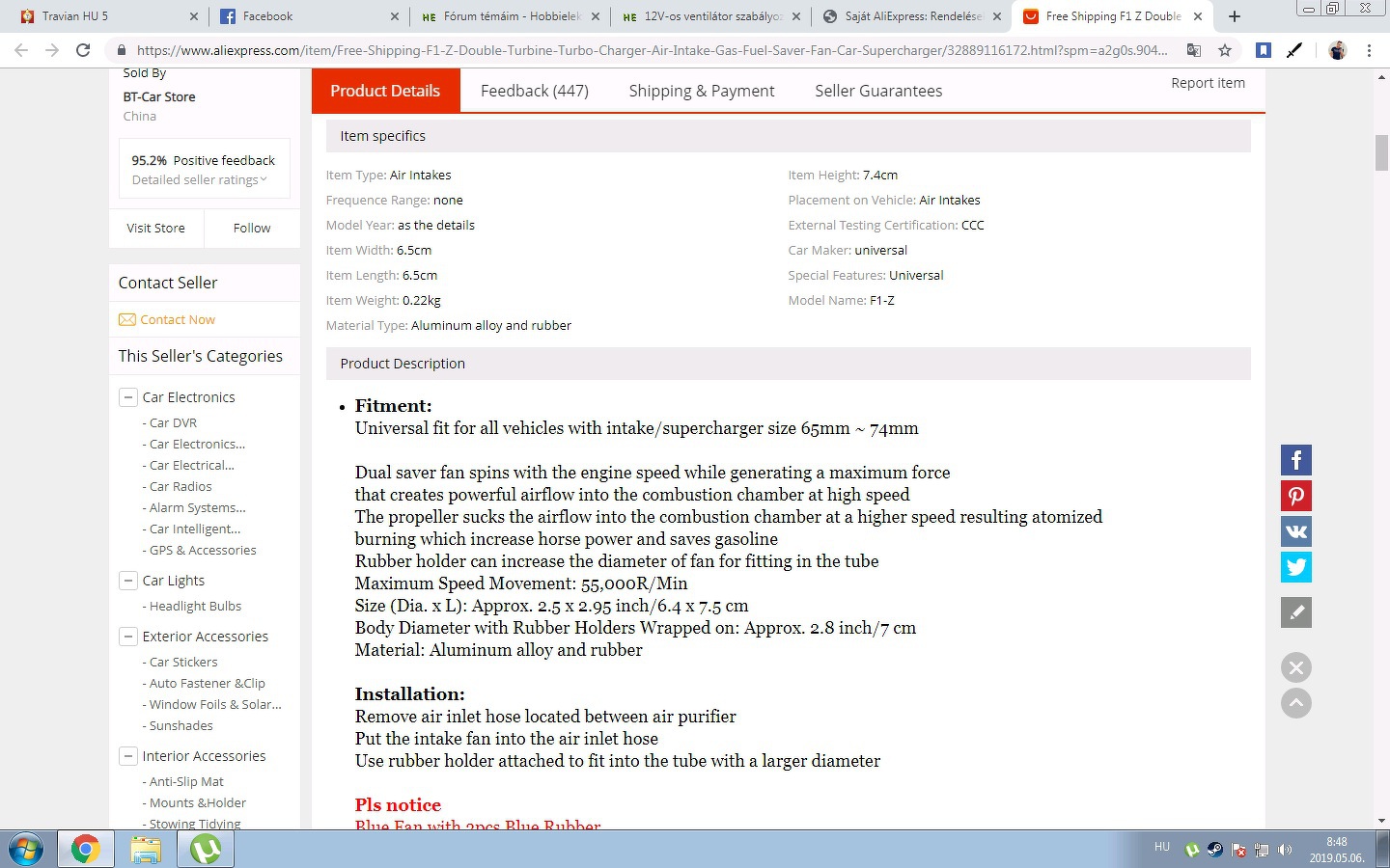 Amit belinkeltél, (bár nem azt tetted) abban motor egy szál sincs, mindössze egy turbinalapát, amit beépítenek a szívó elé. De számomra a szerkezet komolyságát az is jellemzi, hogy lehet kapni piros, kék, fekete színben. Szerintem ez csak korlátozza a légbeömlést. Ha egy ilyen segítene bármiben, akkor rég ott lihegne MINDEN kocsikban. De egyik gyártó sem használja. Továbbá villanymotoros turbót sem láttam még sehol. Pedig sokkal egyszerűbb lenne, mint a kipufogógáz koszosságával, hőmérsékletével kínlódni. Mert ugye komoly gépnél még hatalmas turbó hűtő is van, hogy a sűrűbb hidegebb gázból több fér be a hengerbe. Tehát ez a történet számomra egyáltalán nem az a "gyere buci hamm bekaplak" történet. De a motorodról (ha van ilyesmid egyáltalán) semmit nem tudtunk meg eddig. Ilyen semmitérő fogyasztáscsökkentő izékkel meg tele van minden áruház.. Akkor most mi is a helyzet?