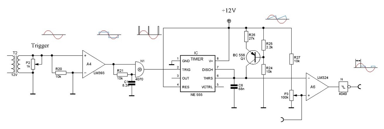 Ha a kapcsolást csak úgy használod ahogy a rajzon van, akkor a P3-mal beállítod a fordulatszámot, üresjáratban, de amikor odatolod neki a szerszámot, akkor a fordulatszám leesik. Célszerű tehát a fordulatszám leesésekor gázt adni. Igen, ezt egy fordulatszámmérő figyelné, a mellékletben mutatottak szerint. Ez csak egy különbségképző, ami a fordulatszám és az alapjel különbségét képezi, de figyelembe kell venni az előjeleket, mert a fázishasító itt fordítva működik, kis feszültségre állít nagy teljesítményt. Az inverter elhagyásával és az utolsó OPA bemeneteinek felcserélésével valószínűleg meg lehet fordítani és ezzel egyszerűbbé is válik a kapcsolás. Ezt nem próbáltam ki. A szabályzást kipróbáltam, nagyszerűen tartja is a fordulatszámot, de azt egész alacsonyra nem tudtam levinni, hogy miért azt nem tudom. Az én esetemben, ami egy mosógépmotor volt a tachométer AC-t adott annk az egyenirányítóját láthatod a rajz bal alsó részénél, max 12V-os fordulatszámot céloztam meg, ott határoltam, hogy a tápnál nagyobb ne legyen. Ja az RV1 csak a tacho jelének a szimulálására van ott, a valóságban az egyenirányító feszültsége van azon a ponton.