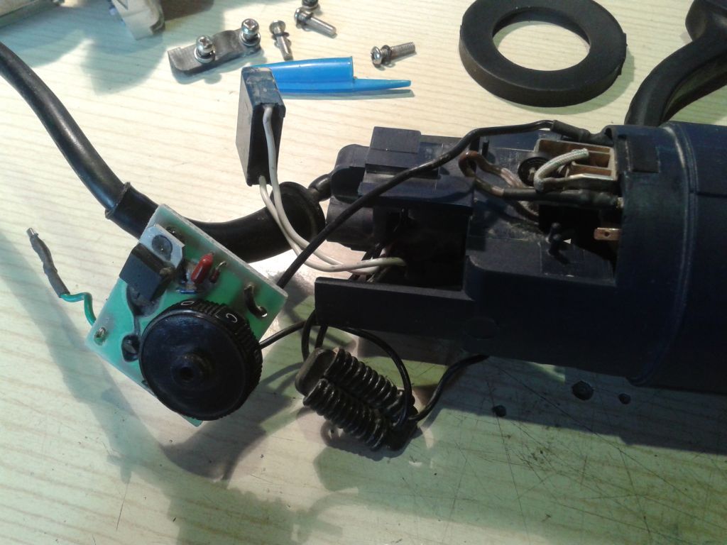 Nem teljesen flex de hasonló gondom van. Felsőmaró az áldozat, Ferm FBF-6E típusú, 550 W-os. A tetejében lévő elektronika megadta magát : A potmétere kapcsolós kivitelű. A maximum fordulatra tekerve kattan egyet,'kiiktatja az áramkört : ekkor a motor rendesen működik. Lejebb tekerve el sem indul,ezért gondoltam,hogy rossz a szabályzó. Szészedve egy 'hagyományos' triacos szabályzó lapul,de egy valami nem világos. A bejövő 230 V-ra párhuzamosan van kötve egy 0.22 µF 275 VAC kondi,majd mindkettő szál ferritre van tekerve. Innen az egyik szál megy egyből az egyik tekercskivezetésre,a másik pedig az elektronikába. Az elektronika kimenete innen a másik tekercsre megy,viszont van egy 3. szál,a zöld vezeték. Ez az egyik oldalon a kefetartó melletti kis sarura megy,rendeltetése ismeretlen. Látszik,hogy a bejövő vezeték és a zöld vezeték között volt egy alkatrész,valószínűleg kondenzátor. Mi lehetett a szerepe? Úgy látom,a triac is cserés,a lábai elfáradtak már...Újra kellene építenem a szabályzót,ebben kérnék egy kis segítséget! Köszönöm szépen! A hozzászólás módosítva: Márc 17, 2013
