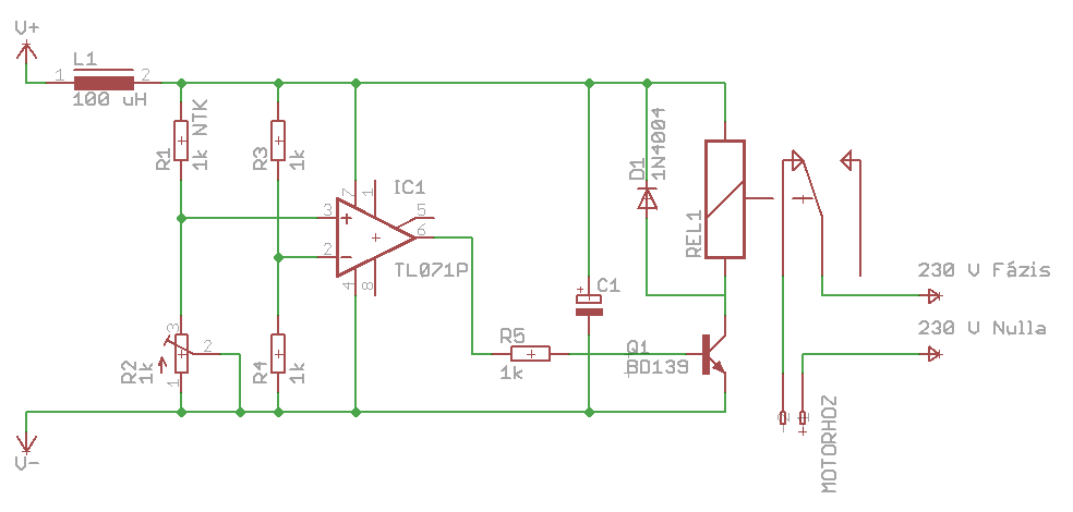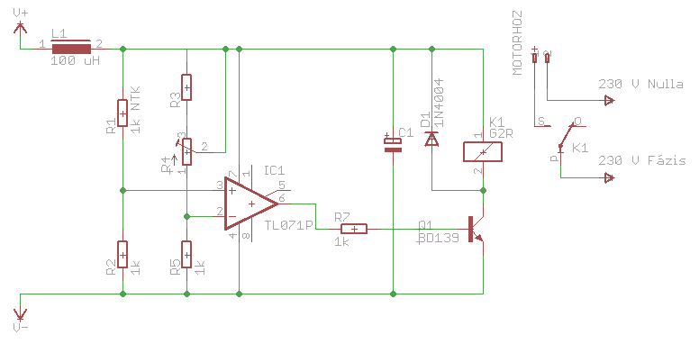 ![]() Az R1 NTC ellenállás és a beállítani kívánt hőmérséklet tartomány alapján R3 és R4 értékét a konkrét megvalósításhoz kell igazítani. A C1 puffer kondenzátor értékét a REL1 relé behúzótekercsének áramfelvételéhez kell méretezni (min. 1 µF/A).