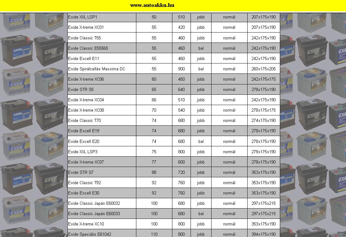 Az EN oszlop jelöli az indítóáram értékeket az egyes akkuknak.