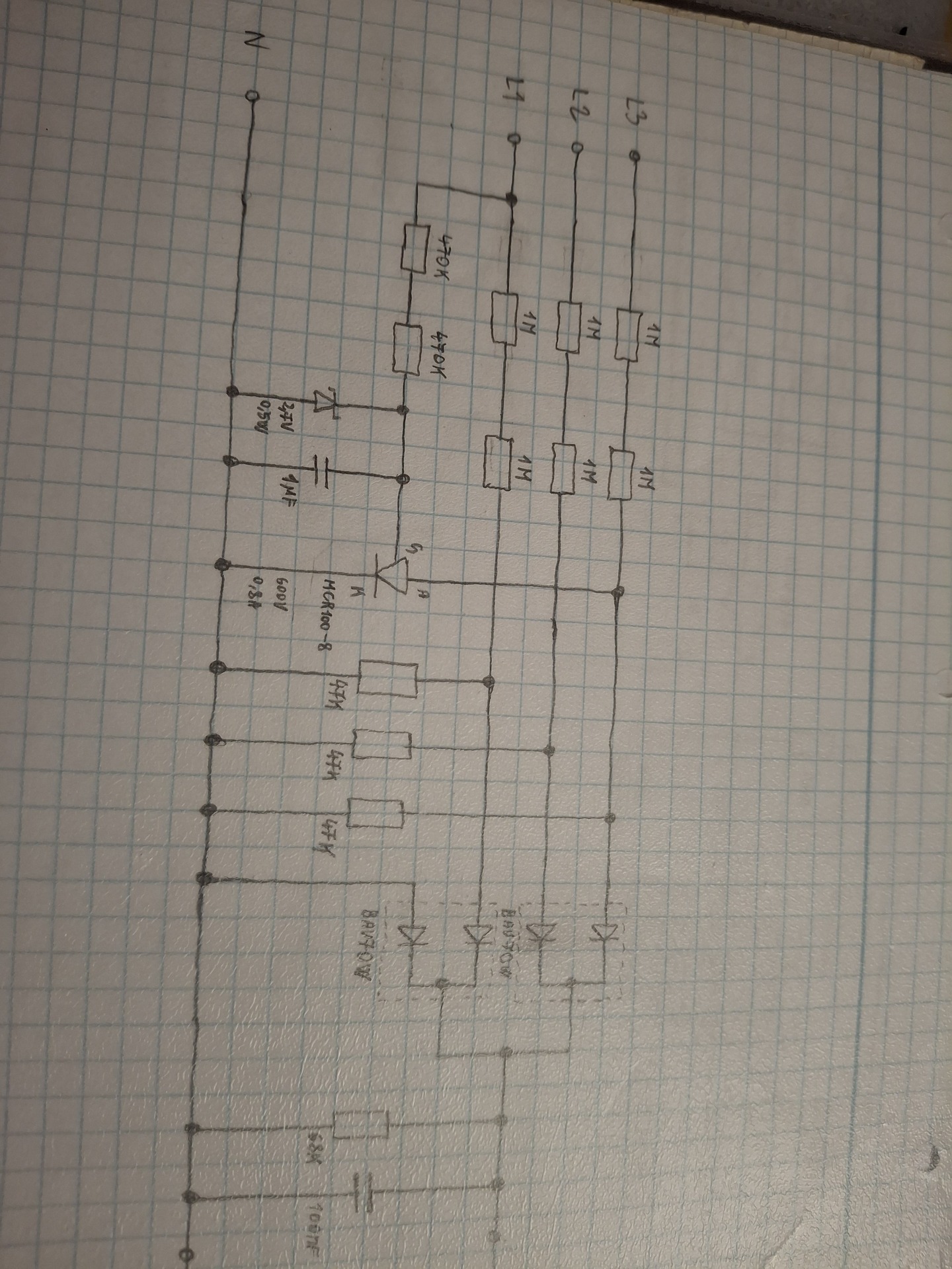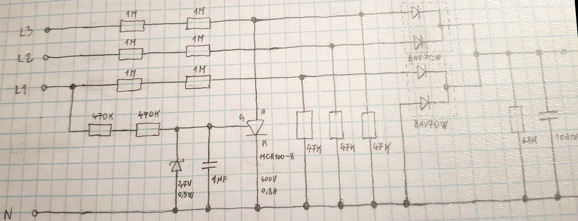 Ez a HRN-55N fázisfigyelő része. A tápja kapcsolóüzemű, ami a 3 fázis egyutas egyenirányításával van megtáplálva. Ergó, ha 1 fázis és a N adott, akkor már jelzi a hibát. Ha pusztán ezt a részt megépíted amit rajzoltam, és a végére teszel egy optocsatolót, akkor van egy galvanikuan leválasztott jeled, ami akkor aktív, ha hiányzik egy fázis, vagy nem jó a fázissorrend.