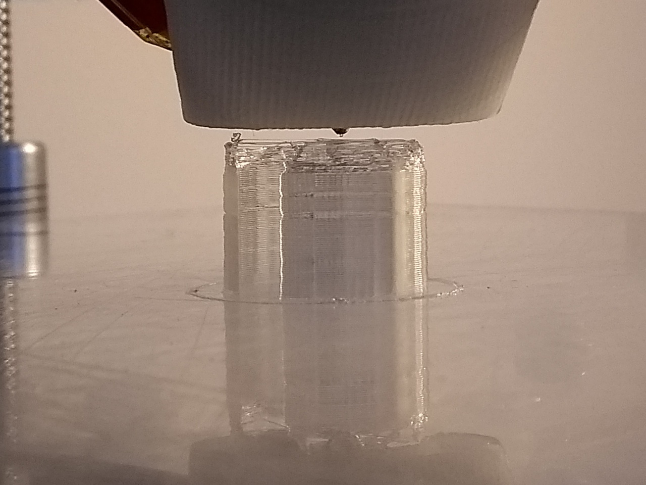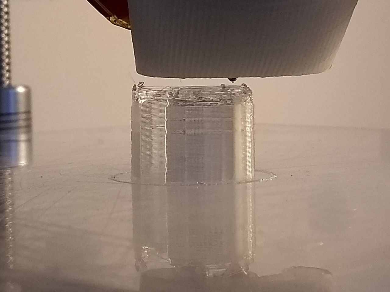Most kissé levágtam az anyagból 1 métert. Nyomtattam hibátlanul több tárgyat is. Új nyomtatófej tartót csináltam. Aztán gondoltam kipróbálom a testing cilinderrel. Hát ez az amiről beszélek. Gondol egyet és nem jön anyag. De volt a rétegek közt is pár kattanás az extruder felől. De tovább ment. A végére meg ilyen lett...