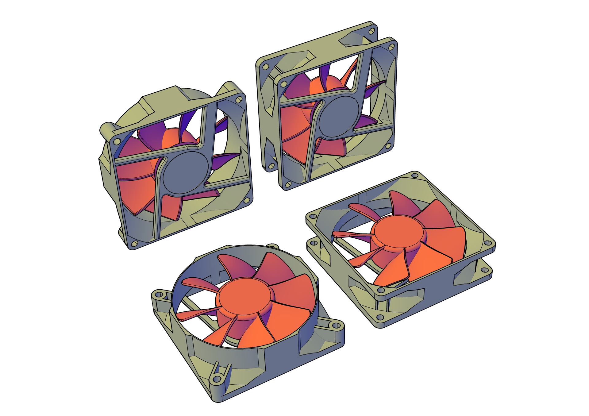 Ventilátor ábrázolásA leválasztós áramforrásomba ventilátor opciót is fontolgatok. A tervezgetés modellező fázisában segítség ha megvan az alkatrész, ezért lerajzoltam. Több -számomra- izgalmas részletet is ki kellett találni, de megoldottam. Sőt mindjárt kétfajta külsővel is megcsináltam, mert ezek így biztosan léteznek, és még nem tudom milyet találok amikor éppen használni fogom. (A forgó rész csak a látvány miatt piros.)