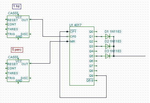 REset utáni 9. órajellel a 4017 leállítja saját magát Q9 clken-en van amikor ez magasra vált több orajel nem jut be a következő resetig (ez a kimenet magasan marad) (szerintem) a reset megszűnése után viszont a következő biztosan teljes ciklussal kezdi ismét az inpulzus leadást( gondolom én).
