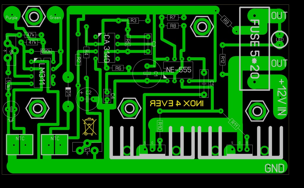 Én személy szerint a lehető legtávolabb raknám ezeket a dolgokat, azaz a két FET menne a panel jobb éléhez, a mostanihoz képest 90 fokkal elforgatva, a bal oldalon lenne a kisáramú vezérlés, és a kettő közé raknám a betáp csatlakoztatást és a biztosítékot. Persze a legjobb az lehetne, ha kicsit négyzetesebbre lehetne venni az alakzatot, és akkor a FET-ek egyúttal lehetnének közel is az NE555-höz, és mellette megtartható lenne a jó elrendezés. A hozzászólás módosítva: Nov 11, 2012