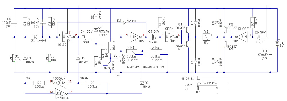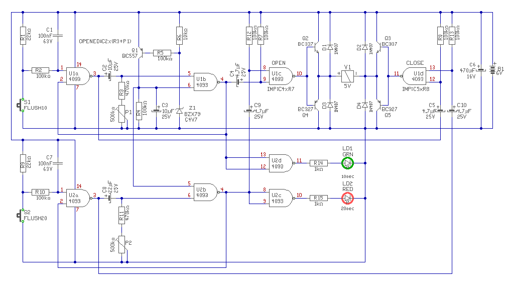 Hello! Megépítettem a két nyomógombos kapcsolást, de nem igazán müködik jól. Az időzitő része az jó, 10 ill. 20 sec időzítésnél világítanak a ledek még tart az időzités, de ahova a mágnesszelepet kell kötni, ott folymatosan jelen van a feszültség. Ha a 10 sec nyomógombot nyomom meg akkor csak egy pillanatra esik le a feszültség, és az időzítés lejárta után is folyamatosan mérhető a 6v. A 20 sec nyomógombot nyomom meg akkor az időzítés lejártáig a feszültség 0v viszont az időzités után megint folyamatosan jelen van a 6v.