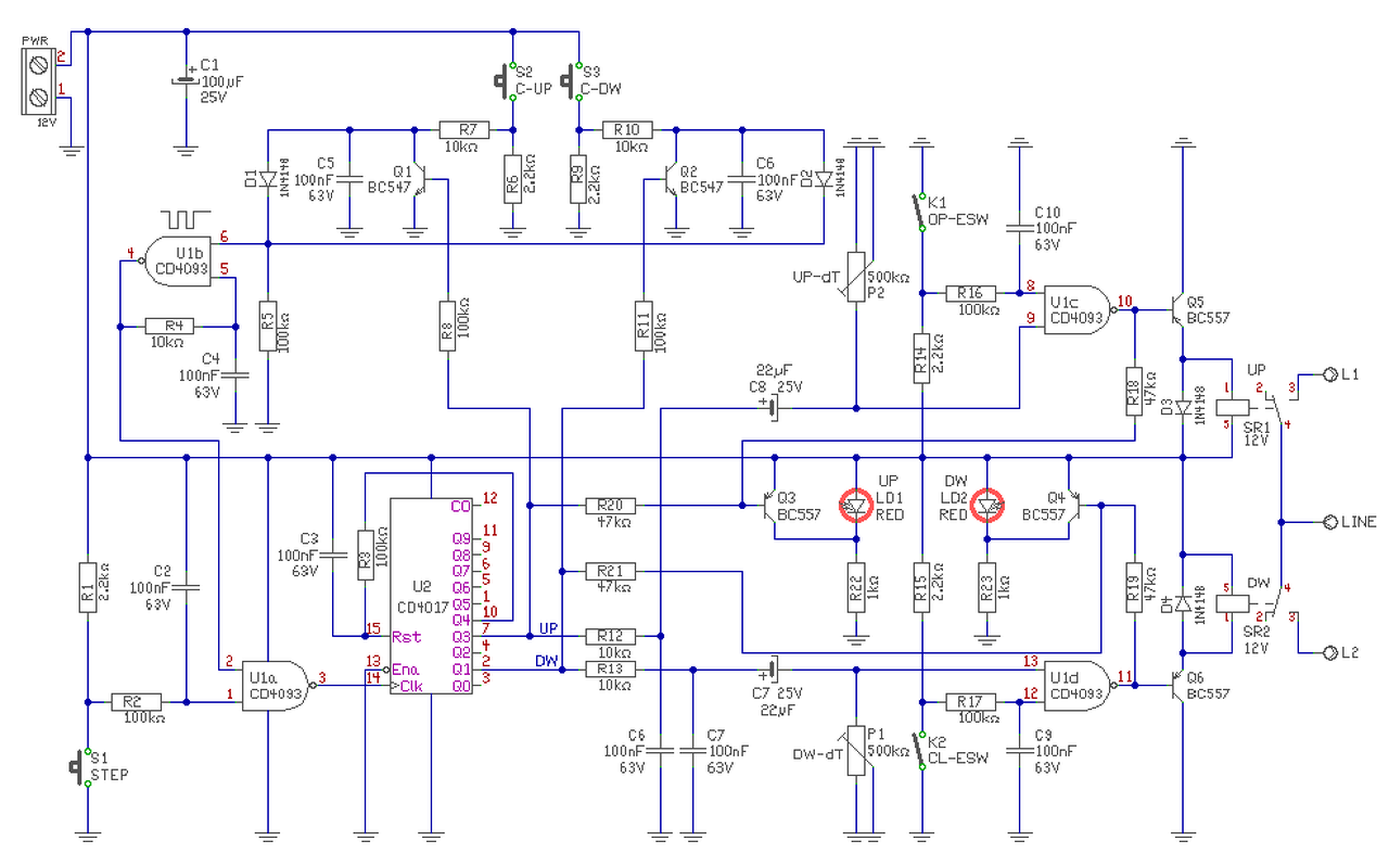 Relékkel is lehet logikai áramköröket létrehozni. De néha az idő hazárdot nehezebb észrevenni, mint logikai áramkörök esetén. (Mivel a reléknek van meghúzás és ejtés idejük, ezen idő alatt a jelek egyidejűsége nem biztosított. IC-nél is van működési idő, ugyan úgy figyelembe kell venni, csak átláthatóbb a dolog.) Megrajzoltam, hogy ezekkel az áramköri elemekkel, kb. hogyan lehet megoldani a dolgot. Hogy működik-e, azt megtudod ha összeállítod. Kicsit a működésről.. - Az U2 ugyan úgy a Stepper feladatot látja el. De a központi kapcsolójel, nem a monostabilt indítja el (mellesleg itt nincs is ilyen) hanem a Steppert lépteti a kívánt funkcióba. - A táp bekapcsolásakor C3 Reset funkciót hajt végre, így a Stepper alaphelyzetbe áll be és nem működtet semmit. - A léptetést két úton lehet véghezvinni. "Hagyományosan" a STEP nyomógomb megnyomásával, vagy az a gyors beléptetéssel. Ezt az U1b ütemadó végzi. - Ha megnyomjuk a C-UP vagy C-DW gombot, akkor pld. az R7 és D1-en keresztül, az U1b 6-so lába magas szintre kerül. Az ütemadó elindul, és U1a-n keresztül lépteti a Steppert. - Ha a Stepper Q3 "UP" kimenete magas lesz, akkor Q1 tranyó alacsony szintre húzza az R7-et. Leáll az ütemadó, és ebben az állásban marad a Stepper. Természetesen a C-DW is ugyan így működik, csak DW állásban fog a Steper megállni. - Ha a Steppert kézzel, vagy a centrál jellel a kívánt funkcióba léptettük, akkor az UP vagy DW kimenet magas szintre kerül. A jel rákerül pld. az R13-C7 integráló tagra. Ez késlelteti a relé meghúzását. Így a funkcióra történő gyors beléptetés alatt a relé nem tud meghúzni, míg a Stepper a kívánt funkcióba be nem áll. - Az időzítést a C7-P1 differenciáló taggal állítjuk be. Amikor DW jel megjelenik, a változást a C7 átviszi U1d 13-as bemenetére. Az magas szintre vált, míg fel nem töltődik a C7. Ekkor az U1d kimenete alacsony szintre vált, és a relé meghúz. Ha letelik C7-P1 idő, akkor az U1d kimenete ismét magas szintre áll és a relé elejt. De elejt akkor is, ha a CL-ESW végállás kapcsoló (elfelejtettem átnevezni DW-ESW-re) bekapcsol. Ez egyből magsa szintre állítja az U1d kimenetét és a relé elejt. - Már csak a Led jelzés van hátra. Az LD2 led akkor jelez, ha a DW kimenet magas szintű, és az U1d is már elejtette a relét. Ekkor Q4 lezár, és világíthat az LD2. Vagy is jelzés akkor van, ha a Stepper DW állásban van, és a relé (már az idő letelte miatt, vagy mert beért a végállás helyzetbe) elejtett. Ha a Stepper bármely más funkcióban van, akkor a Led sötét lesz. - A C-UP vagy C-DW által beléptetett Stepper vezérlés alatt, megnyomjuk a STEP nyomógombot, a megfelelő motor leáll. A Centrál bementek közvetlen párhuzamosíthatóak, az együtt működtetéshez. Remélhetőleg így is fog működni, ahogy leírtam.