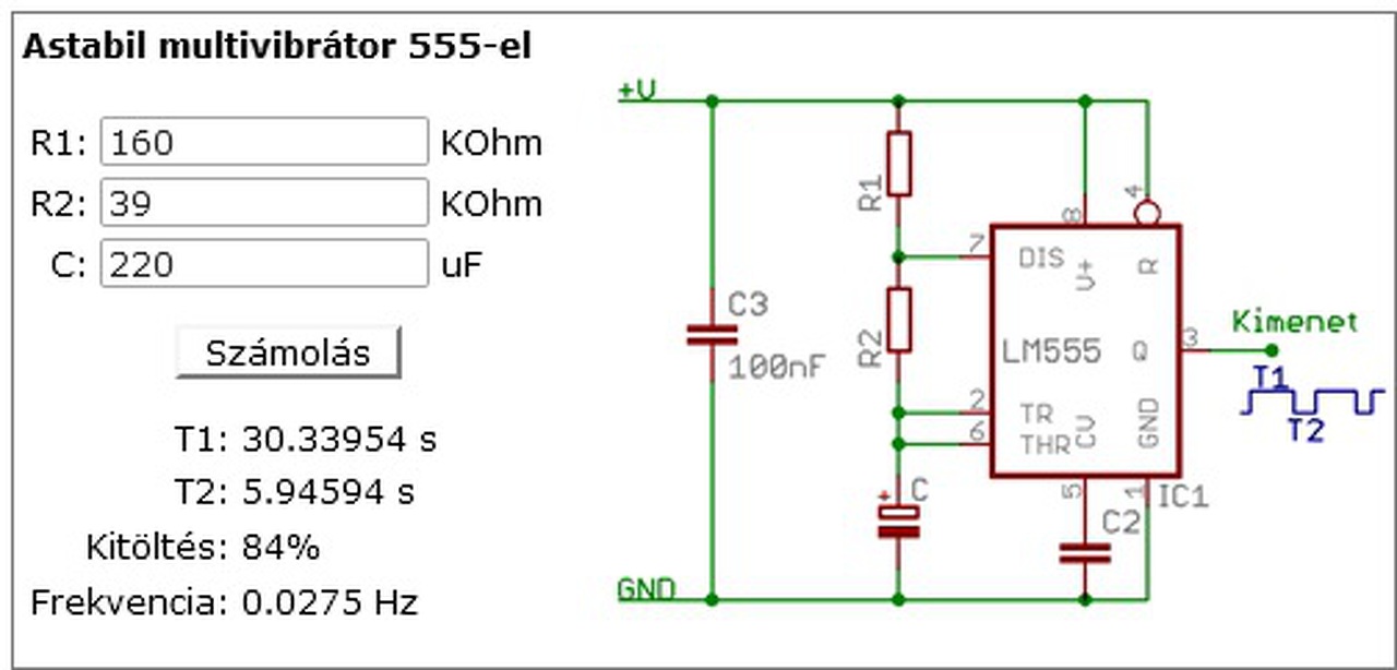 Keress a képek között olyant, ahol a 7. és 2,6. lábak között találsz egy potit és 2 db kis diódát. Azzal tudod beállítani a kitöltést, azaz a be-és ki állapotot a 3. lábon, a kimeneten. Rögtön az elsőn már láthatod is az elvét. Csak az értékeket kell megváltoztatnod. A hozzászólás módosítva: Aug 24, 2016