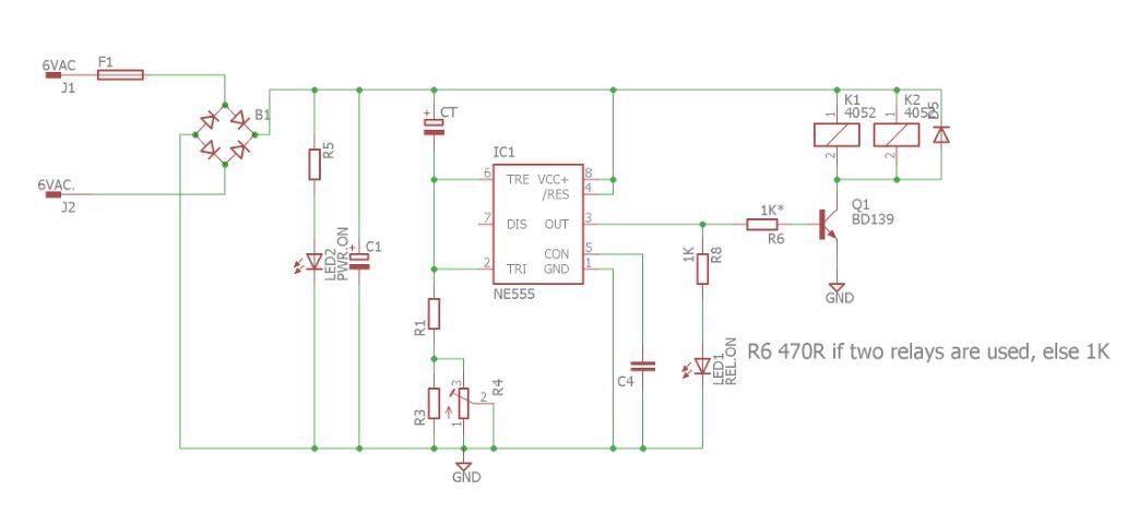 Csatoltam egy nagyon jól működő időzítő kapcsolási rajzát, melyet proli007 tervezett nekem (is). A problémám az, hogy szeretnék két ilyet egymás mellé tenni úgy, hogy az első NE555-ös tag 3-as lába nemcsak a relét húzná be, hanem a második NE555-ös 2-es lábára is rámenne. Azaz először az első fokozat csinálná a dolgát, aztán a második (pl. mindkettő külön meghajtana egy-egy motort). Ami fontos, hogy mindig ebben a sorrendben menjen, bárhogy is kapcsoljuk fel-le a tápot vagy az indító kapcsolót (persze nem össze vissza). Meg is csináltam, de közben rájöttem, hogy ilyenkor a 4-es lábakat össze kell kötni. Itt van a gondom, hogy van ahol a közös 4-es lábat 1MOhmos és 100nF-es kondi "közé" rakják (az ellenállás a +9V-ra, a kondi a testre van kötve), van ahol csak lekötik egy 1kOhmos ellenállással a testre. Amennyire emlékszem, ennél az esetnél a közös számolás miatt kell a 4-es lábat alacsonyan tartani. Ha valakinek van véleménye, akkor kérem írjon! Előre is köszönöm! Üdvözlettel: olika76
