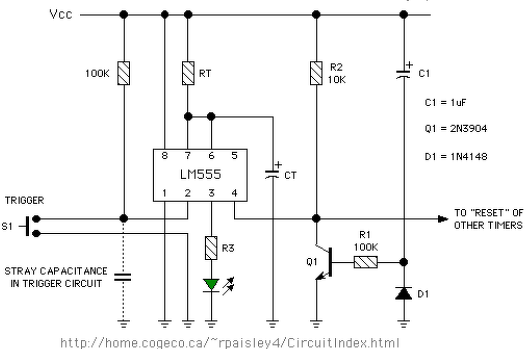 Hello! A hozzászólás szerinti a kép alapján megoldható. Vagy is differenciáló tagot kell a trigger láb elé készíteni. Az R1-et célszerű kisebbre választani pld. 2.2k-ra. Ha a kapcsoló bontására szeretnéd indítani, akkor R1-et és a kapcsolót fel kell cserélni.