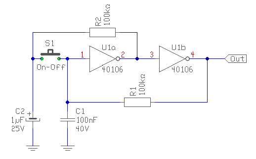 Erre a hosszú-rövid időzítésre, akkor lenne szükség, ha a nyomógombnak nem két, hanem három funkciója lenne. (Még akkor készítettem ilyen áramkört, mikor még nem voltak távirányítós TV-k nálunk. Ha röviden nyomkodtad a gombot, akkor léptette a hangerőt, ha hosszan, akkor irányt váltott.) Ebben az egyszerű kapcsolásban CD40106 IC van használva. Ebben 6db inverter van, amiből csak kettőt használok. Tehát még három fokozatot is lehetne vele készíteni. A 100nF-os kondi, gondoskodik arról, hogy bekapcsoláskor a kimenet alacsony szintű legyen (hogy hálózat kimaradás után, ne égjen a lámpa, mikor megjön a villany) és egyben a zavarérzékenységet is csökkenti. Tápfesznek 3..15V-ig használhatsz bármit. üdv! proli007