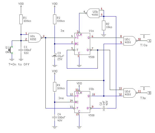 Valami ilyesmire gondoltam. (persze nem tudom, honnan hozod a jelet és hova viszed. Én egy nyomógombos áramkört rajzoltam, így a bemenetén némi prellgátlás van. A kimeneten, meg 1ms-os lefutó tüskét ad. (Ha igaz, mert csak rajzoltam, nem próbáltam ki.) Egy hiba lehet így ránézésre, hogy ha pont a 3sec lejártakor engeded el a gombot, lehet A és B impulzust is fog adni. üdv! proli007