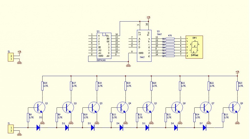 A diódás tranzisztoros lánc jó. Az SN74148 lábkiosztása nem jó. egyébként sem mert -bocsi- a 147-s kell. A 148 az 0-7 kódol s neked a 8 is kell. Az sn74147 0-9 -ig. Mellékeltem az adatlapját. A tranzisztorok kollektorait kell az Ic bementeire kötni. A következő képpen. Az első tranzisztor kollektora a d2 / 12. láb és értelemszerűen így tovább. A D1 -t kösd testre. A kimenetekre kell egy egy inverter. Ami lehet egy tranzisztoros vagy az Sn 7404 alkalmazása.Én a tranzisztoros megoldást alkalmaznám. Egyébként a kimenetet értelemszerűen súlyozva össze kell kötni a szegmens meghajtóval. SN747-nél a 4. láb szintén + ra Lásd adatlap.