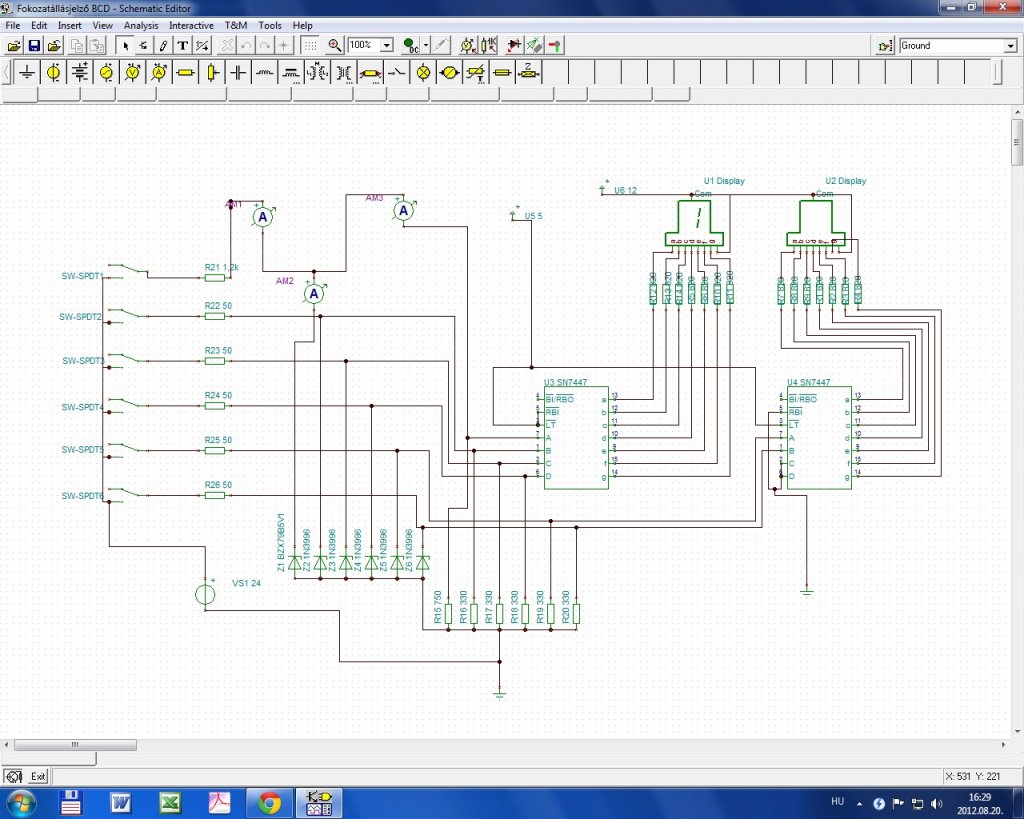 Ha elfogadod. akkor azt mondanám, nem lesznek jók azok a munkaellenállások, 5V-ra vannak méretezve a szegmensek felől. Nagyobbra növelném az értékeket, legalább (220-330) Ohm-ra. Annyit még érdemes talán megjegyezni, hogy mind a hat digit szegmens-árama ezeken az ellenállásokon folyik a 7447 felé. (Ha 20mA folyna egy szegmensen, akkor egy "időpillanatban" az hatszor annyi áram is lehet a multiplex meghajtás miatt !)
