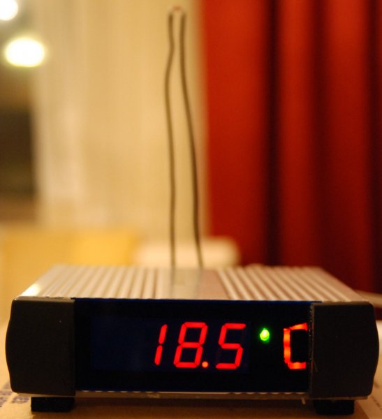 Sok diódát átnéztem (kb. 30) és sikerült két olyan diódát találni ami között csak 0,3 fok az eltérés. Többet nem kinlódok vele. Feltettem 2 képet a cuccról. A fokjelző led szine jelzi, hogy hogy kinti vagy benti hőmérséklet (Zöld, Piros). Hátul van egy 3 állásu kapcsoló, egy 2. érzékelő bemenet, és a táp bemet.