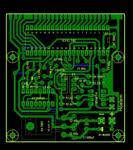 Elkészítettem a rajzot. LM35-öt tettem bele. Beállítani úgy kell, hogy először nem ültetjük be a 12kohm-os ellenállást. - A hőelem bemenetre, akkora feszültséget adunk, hogy az IC kimenetén 1,999V legyen. (kb. -8..9mV) Majd referencia potival, a DVM mutatott értékét P3-al 199,9 fokra kell beállítani. - Majd a hőelem bemenetre, -8,12mV-ot kapcsolva, a P2-vel ismét 199,9 fokra állítjuk. - Rákapcsolva a hőelemet, és visszatéve a 12kohm-ot, a P1 potival a környezeti hőmérsékletnek megfelelő értéket állítunk be a kijelzőn. (közben a hőelemet nem tapizzuk.) - Ez után lehet kalibrálni a mérést. 0 fokon (kevert olvadt jégben) P1-el, és 100fokon forrásban lévő vízzel P2-vel. Kalibrációt iterációval végezzük el. (Az LM35 tokjának, és a hőelem becsatlakozó pontjának, termikus kapcsolatban kell lenni. Mert ez alkotja a hidegpontot.) üdv! proli007