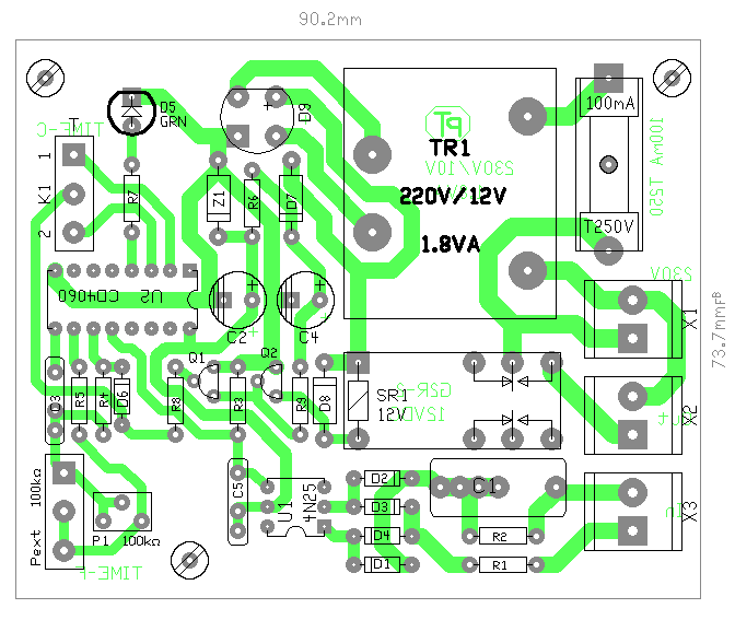Nos akkor kész van. Ha csak állandó időtartományt akarsz, akkor nem kell K1 helyére kapcsoló, elég a panelen rövidrezárni a kívánt pontot. Ha nem akarod állítgatni sem, akkor elég bele egy trimmer poti, ha szeretnéd kívülről állítani az időt, akkor a mellette lévő pontokra beköthetsz egy külső potit.