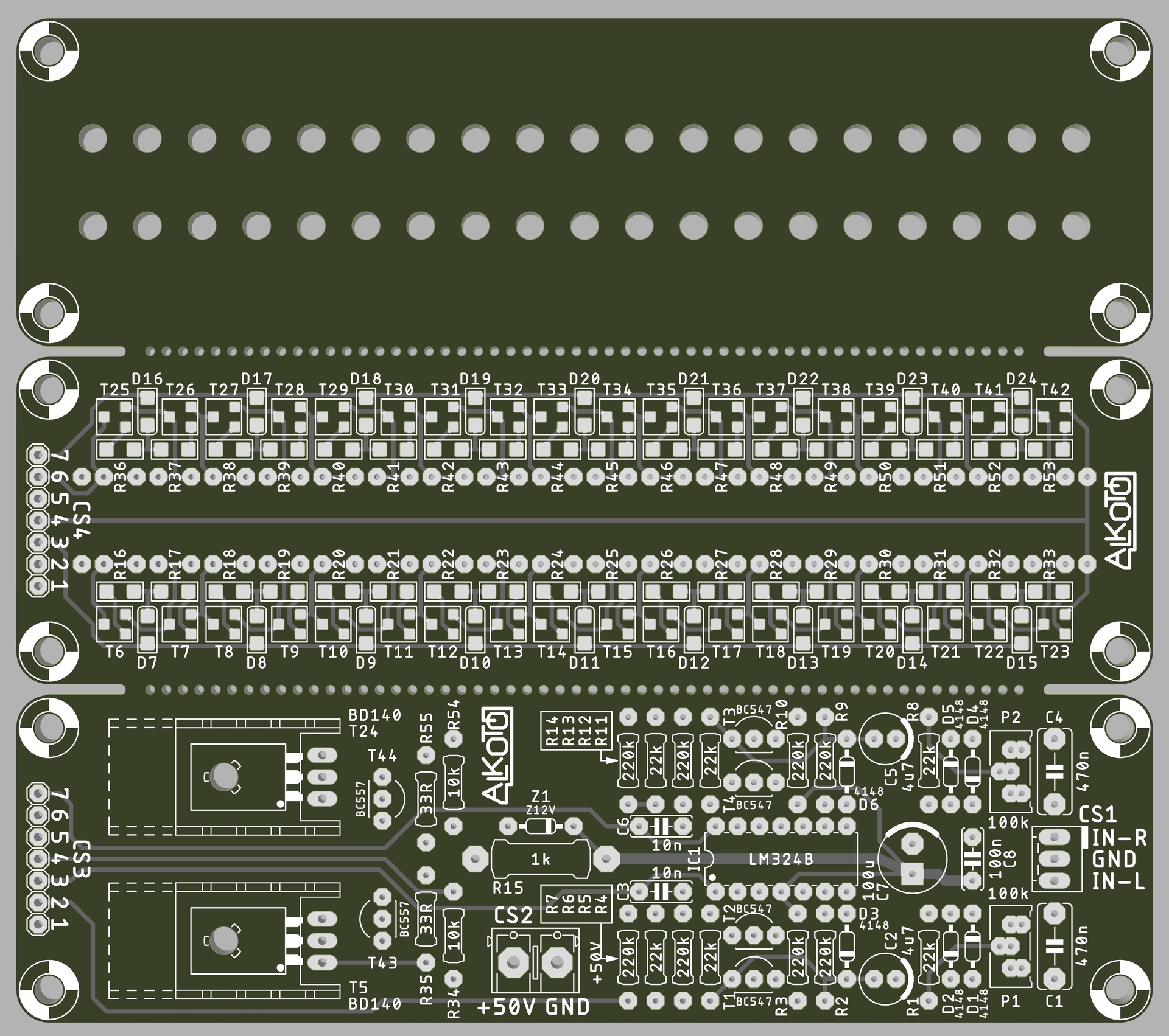 Ez kicsit eltér a korábbitól, de véleményem szerint praktikusabb, könnyebben integrálható sok erősítőbe. +50V tápfeszültséget igényel, ami sok erősítő alapfeszültsége. Van egy olyan változat, ahol a LED-panelen felületszerelt alkatrészek vannak, ezért a két panel minimális távolsággal tehető egymás alá.