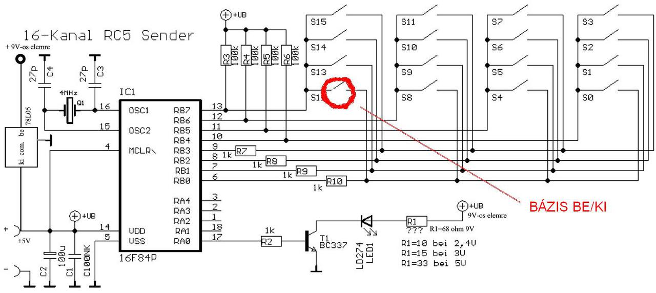 A 16F84 távirányító, ami 0 készülékcímet küld. A gombok kódjai: 0 .. 15.