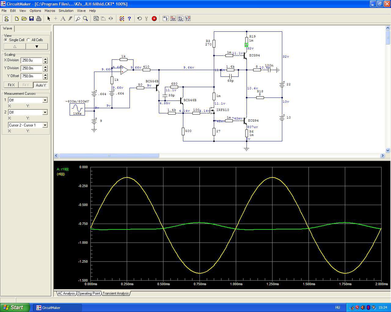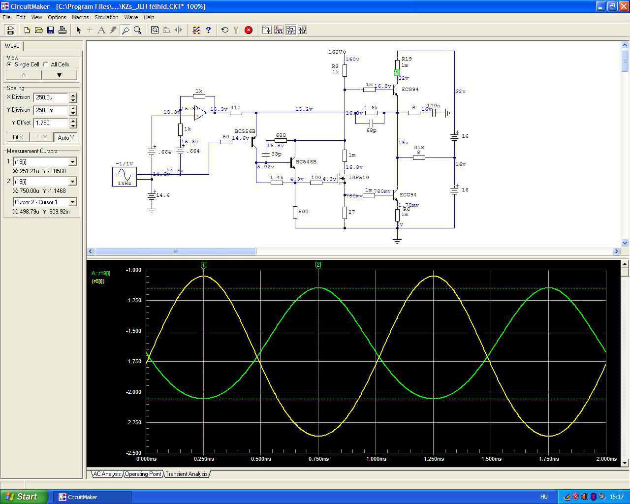 Az alapkapcsolás ilyen fokú módosítását nagyon át kell gondolni. A KZs-féle szimmetrizálást roppant szellemesnek tartom, de a maga a kapcsolás szerintem teljesen átgondolatlan. A legnagyobb problémát a rossz hatásfokában látom, mert 84W disszipáció mellett kevés a kivehető 3W kimeneti teljesítmény (nem számoltam még ennek utána, csak írtam valamit). Ha 600 Ohmos a trafód, akkor nyilván ehhez kell majd illeszteni... de mi lesz a többiekkel akiknek nincs ilyen trafójuk, viszont mégis szeretnék megépíteni. Legcélszerűbbnek látszik úgy kialakítani a bemenetet, hogy legalább bizonyos határok között érzéketlen legyen a meghajtó impedanciára. Ez nem (ez sem) lesz egyszerű. Ha sikerülne is az egész kapcsolást műszakilag tökéletesre kitalálni, pontosabban a "tökéletest" valamennyire megközelíteni, akkor sem biztos, hogy ez fog a legszebben muzsikálni. Ma szimulálgattam kicsit és kiderült, kissé "benéztem" tegnap a teljes hídban a végtranzisztorok áramviszonyait. A felső végtranzisztoron folyó áram ugyanis terhelésfüggő (első két kép). Csakis akkor lesz a terhelésre szimmetrikus a két végtranzisztor ha a nagyjelű erősítő munkaellenállását áramgenerátorra cseréljük, vagy megtartjuk a JLH-féle utánhúzó kondit.... ez utóbbival lenne legnagyobb a kivezérelhetőség is. Ez a kapcsolás ki volt már egyszer találva és elég jól. De ha azt mondjuk, hogy az utánhúzás ront a hangon, áramgenerátorral is ki lehet próbálni. Ez lesz az első két ki-bedugdosós "öcsi panel"... már ha van kedvünk az ilyesmihez...