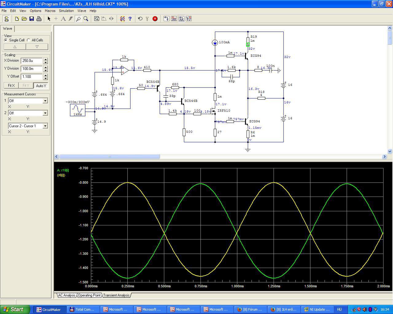Idézet: „De van egy olyan aggályom ezzel a JLH-val kapcsolatban, ha ezt megépítik mondjuk százan, akkor az a száz végfok százféleképpen fog szólni. A legjobban sikerült valószínűleg olyan lesz, mint amit Komáromi Zsombor leírt, hogy a hangok kilépnek a dobozból és a zene szárnyalni kezd. A legrosszabbul sikerült viszont esetleg sziszegős, torz, rikácsolós, hallgathatatlan. A maradék 98 pedig valahol a kettő között fog elhelyezkedni. Azt gondolom, ez a végfok inkább hangszer, mint gép. Műszerek kellenek hozzá, fül kell hozzá, türelem kell hozzá, jó alkatrészek kellenek, jó tápegység, jó nyákterv és rengeteg idő mire "behangolja" az ember a saját rendszeréhez.” Ebben valószínűleg igazad van, bár nem hiszem, hogy ezek után lesz valaki rajtam kívül akit ez a kapcsolás komolyan érdekel . Ha mégis akkor fel lehet hívni a figyelmet a kapcsolás érzékenységére. (Nem gondoltam ennyire problémásnak a dolgot - ebből is látszik, hogy mennyire nem értek hozzá).Idézet: „A KZs-féle szimmetrizálást roppant szellemesnek tartom, de a maga a kapcsolás szerintem teljesen átgondolatlan.” Csak, hogy tisztázzuk: Csak az én MOSFET meghajtós változatomat tartod átgondolatlannak (ezt el tudom fogadni ) vagy KZs félét is ahol a meghajtó tranzisztor bipoláris?Idézet: „A legnagyobb problémát a rossz hatásfokában látom, mert 84W disszipáció mellett kevés a kivehető 3W kimeneti teljesítmény (nem számoltam még ennek utána, csak írtam valamit).” Van az talán 13 W is (600 Ohmos bemeneti és 6 Ohmos terhelő impedancia mellett) . Ez mondjuk engem annyira nem zavar, az eredeti JLH sem egy "izompacsirta". Viszont ez a teljesítmény úgy ennyi, hogy a TINA egyformának veszi a végtranzisztorok bétáját, ha KZs. ajánlását figyelembe veszem akkor a kivezérelhetőség valamelyest növelhető.Idézet: „A felső végtranzisztoron folyó áram ugyanis terhelésfüggő (első két kép). Csakis akkor lesz a terhelésre szimmetrikus a két végtranzisztor ha a nagyjelű erősítő munkaellenállását áramgenerátorra cseréljük, vagy megtartjuk a JLH-féle utánhúzó kondit.... ez utóbbival lenne legnagyobb a kivezérelhetőség is. Ez a kapcsolás ki volt már egyszer találva és elég jól. De ha azt mondjuk, hogy az utánhúzás ront a hangon, áramgenerátorral is ki lehet próbálni. Ez lesz az első két ki-bedugdosós "öcsi panel"” Ha jól értettem a cikket KZs. mindkettőt elvetette és helyette a végtranzisztor párok bétáinak különbözőségével próbálta elérni a nagyobb kivezérelhetőséget, amit aztán a TINA-ban modellezett is. Az utánhúzó kondi és az áramgenerátor után ez a 3. talán legnehezebben kivitelezhető verzió. Sajnos nem tudom hogyan kell a TINA félvezető modelljében átállítani a bétát. Az ajánlott kompenzálással most nekem is stabil.