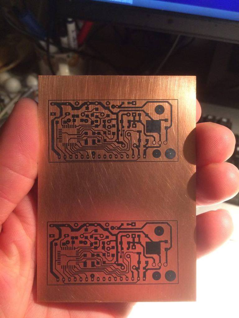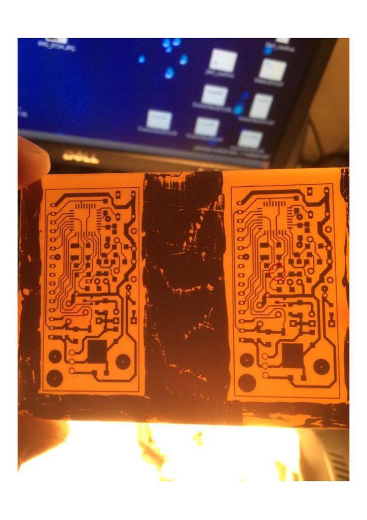 Jó estét mindenkinek! Szeretném megmutatni az első vasalt NYÁK-ot amit készítettem, igazából nem nagy dolog, csak visszaolvastam, hogy mennyi nyűg van vele és ahhoz képest nekem meglepően simán ment... Szóval a rajzolat fotó papírra (legolcsóbb a multinál) került egy Samsung M2026W által (gyári toner). A fóliás lemezt folyó víz alatt nagyon erős mosogató szivaccsal fényesre csiszoltam míg egyenletesen szét terült rajta a víz, utána isopropil alkohollal áttöröltem és ráragasztottam papír szalaggal a nyomtatott fotópapírt,ezután átengedtem 20x egy sima laminálón (szintén a multitól). A laminálóval szerencsém volt mert nem kellett mechanikailag belenyúlni; a felső hengert rugó szorítja az alsóhoz így kb. 3mm-t is simán átvisz. A pirossal bekarikázott rész az egyetlen hiba a panelen, mert kb. a 15. átengedésnél alánéztem a papírnak, mindenhol szépen megtapadt a festék, csak ott tépte fel, gyorsan visszaragasztottam és még egy párszor át toltam. Laminálás után a papírt forró vízzel távolítottam el, egyszerűen a vízforralóból ráöntöttem, a maradékot az erős mosogató szivaccsal távolítottam el. Maratás után a festéket szintén az erős szivaccsal távolítottam el. A két panel közötti érdekes mintázat azért van, mert szerettem volna megóvni a kihasználatlan rézfelületet, sajnos a filc amivel befestettem nem volt megfelelő.