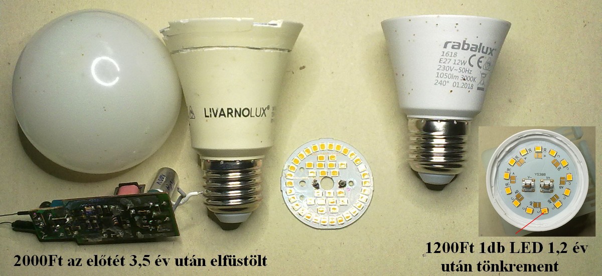 A bal oldali lidlis livarnolux, 2000Ft volt az ára és 3,5 évet bírt, aztán elfüstölt az áramgenerátora. A másik egy szaküzletben vett rába(szol)lux, ez 1180Ft volt és éppen csak túlélte az 1 év garanciát, majd kilyukadt benne egy led. Ez utóbbi igazi mérnöki munka, így kell ezt csinálni, bírja ki a garidőt majd menjen tönkre. ![]() Nem tudom mennyit mennek, de sacc/kb. napi 4 óra körül éves átlagban. Akinek van tapasztalata az megírhatná hogy hol és milyet, pláne mennyiért érdemes venni, amiből nem lesz rövid úton ipari hulladék. Tehát hosszútávú tapasztalatokra lennék kíváncsi, nem a szerintem-mel kezdődő mondatokra. Vagy olyan vállalható árú és kinézetű lámpatestre, amibe belefér 6-8db 5W-os COB LED a hűtésével és a kondenzátoros előtétével együtt, és felrakható egy csillár helyére a mennyezetre.