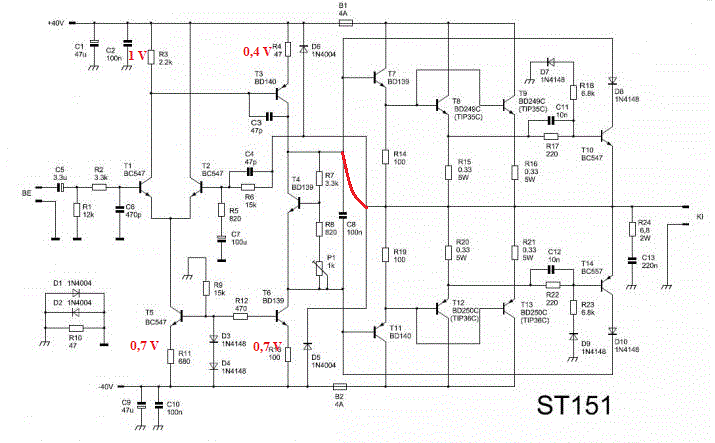 Szia! Ha nincs a kimeneten hangszóró akkor az N-es és a P-s végtranzisztor emitter-ellenállásokon azonos áramnak kell folynia. Mekkora a kimeneti egyenfeszültség?