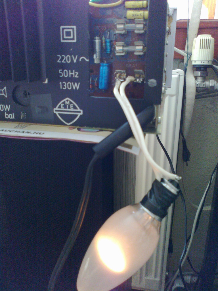 A Cleopatra leírása nem jó hozzá, mert más a tápja. Ha lehúzod a tápcsatlakozót, akkor csak a graetz és a puffer lesz a tápkörben. Így nem világíthat az izzó. A puffereket is le lehet forrasztani, ekkor már csak a graetz marad a körben. Ha még mindig világít, akkor a táppanelről le kell kötni a trafó lábait, ekkor már csak trafóhiba lehet. Ha zárlatos a graezt, akkor érdemesebb nagyobb típust beültetni (Lomex [20-01-15] 25A 800V GBJ2508).