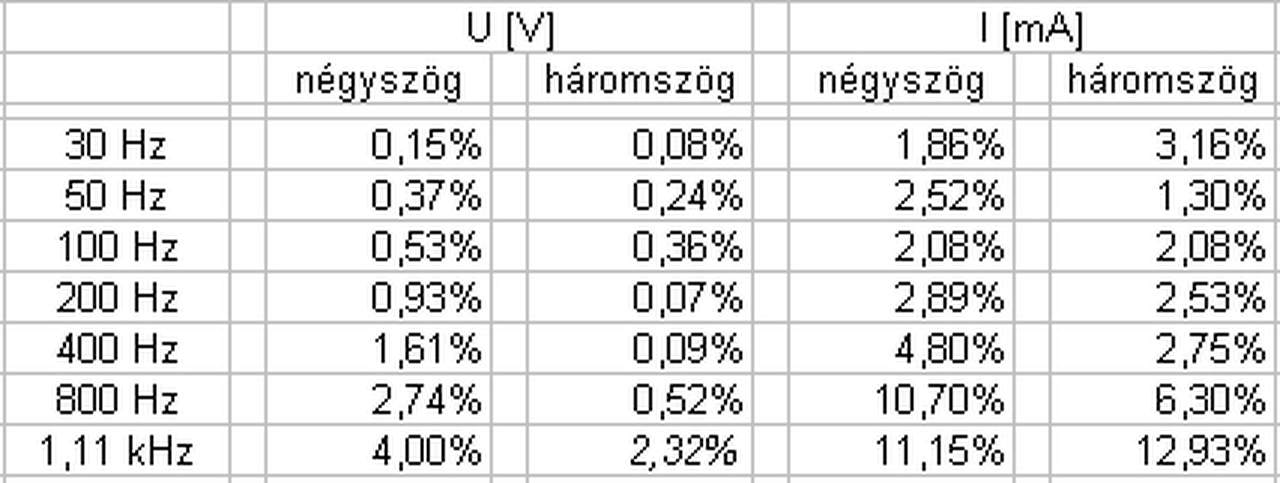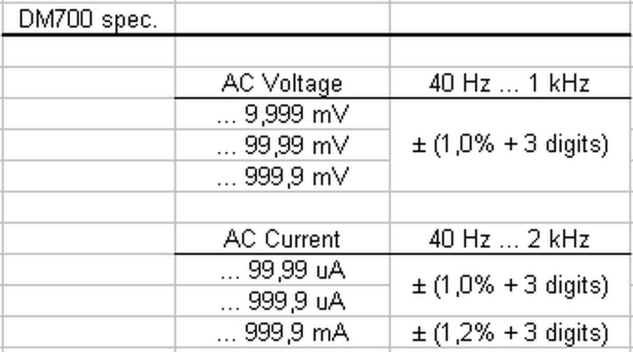 Korábban szó volt az ANENG AN8008 multiméterről. A Zotek gyártja ezt a családot, több címkével is kaphatók, belül ugyanaz pl. az ANENG AN8008, az AUTOOL dm700 és a ZOTEK (ZOYI) ZT109 (vagy az AN8001, DM201, ZT101, a szintén TRMS modellek). Skori írta korábban a dm700-ról: Idézet: „A trueRMS-t viszont csak 50Hz-es alapharmonikuson lehet használni, egy 400Hz-ről üzemelő antiparalel led-páros áramát már nem tudtam megmérni vele (0mA-t muat), és ugyanezen a leden az RMS feszültségmérés sem mutatott használható értéket.” Ezt azóta megbeszéltük vele, hogy az általa mért (illetve nem mért) érték elsősorban annak volt köszönhető, hogy egy 3...4 mA nagyságrendű áramot akart mérni a 999,9 mA méréshatárnál. A műszer specifikációja (ld. táblázatban is alább) ennél a méréshatárnál, AC árammérésnél ± 1,2% + 3 digits. Ebből kiszámolható, hogy a 3...4 mA a specifikált hibaértéknél is jóval kisebb mennyiség, nem csoda, hogy "szegény kis műszer" nem mutatott semmit. Magam is kíváncsi voltam, hogy mit is mérnek ezek az "óccsó" multiméterek TRMS gyanánt, ezért csináltam egy összehasonlító mérést, a dm700 egy profi ($250+ kategóriájú), valóban True RMS műszer ellenében. Pár szó a mérésről: - mért jelalakok: négyszögjel, háromszögjel; - mért frekvenciák: 30 Hz, 50 Hz, 100 Hz, 200 Hz, 400 Hz, 800 Hz, 1,11 kHz - az utolsó szándékosan lett kicsit a specifikáció fölé "lőve"; - mért mennyiségek: feszültség, 10...12 V tartományban, áramerősség, 20 mA tartományban - megintcsak szándékosan "szivatva" a kis műszert, egyrészt a 9999 kijelzés miatt 10 V fölött "elveszít" egy digitet, másrészt a ~20 mA újfent eléggé a méréshatár alján van, tehát erősen hibaszázalék közelében. Az eredmények a lenti táblázatban láthatók, százalékban az eltérés a profi műszer által mért értékektől. Nem számoltam át X % + Y digit formátumra, ami kicsit pontosabb képet adna, valamint nem sávoztam be a másik műszer hibatartományához viszonyítva, de még így is jól látható a lényeg: - feszültségmérésnél 200 Hz-ig gond nélkül hozza a a gyári specifikációt, de még 800 Hz-nél is elég jó, csak a négyszögjel "viseli meg" kissé. Viszont még 1 kHz fölött is értelmezhető értékeket mutat. Vegyük még hozzá, hogy eggyel magasabb, a 99,99 V méréshatárban kellett mérnie. - árammérésnél már valamivel árnyaltabb a helyzet, de ha hozzávesszük, hogy a mért mennyiség eleve hibahatár közelében volt, akkor elég jóknak mondhatók az eredmények, bár a papírformát nem igazolják vissza. Itt is a 200 Hz a választóvonal, és a négyszögjelet szintén nem annyira kedveli a nagyobb frekvenciákon. Konklúzió: egy ~4.500,- Ft-os műszerről beszélünk (amelynek egyébként van számos egyéb igen jó paramétere, tulajdonsága), ezért "tehéntől lódobogást" azért ne várjunk. Ezzel együtt 200 Hz-ig bátran elfogadhatjuk TRMS műszernek, az 1...2% hobbi szinten abszolút elégséges (ahogy a 0,5% alap DC pontosság is). 400 Hz ... 1kHz között pedig "tájékoztató jelleggel, de mégis valamilyen támpont a nem tiszta szinuszos váltakozó feszültség és áram True RMS mérésére. Magánvélemény: ezt a dm700-at és egy DM201-et (ami csaknem ugyanazt tudja, mint a dm700, csak 3.000 Ft-ért...) használom augusztus óta, napi rendszerességgel. Eleinte rá-rámértem a profi DMM-mel is, hogy lássam a két kicsi "merre jár", de pár hét után eltettem az asztalról, és csak ezeket használom. Volt már a kezemben többféle Maxwell (soha többé), egy-két Uni-T (nem győzőtt meg), és persze pár Fluke is (csak az ára...), hétköznapi (hobbi) használatra ezek a kis műszerek nekem beváltak. Ahogy Skori is írta: Idézet: „Mindent összevetve, ár-érték arányra kimondottan jó!”