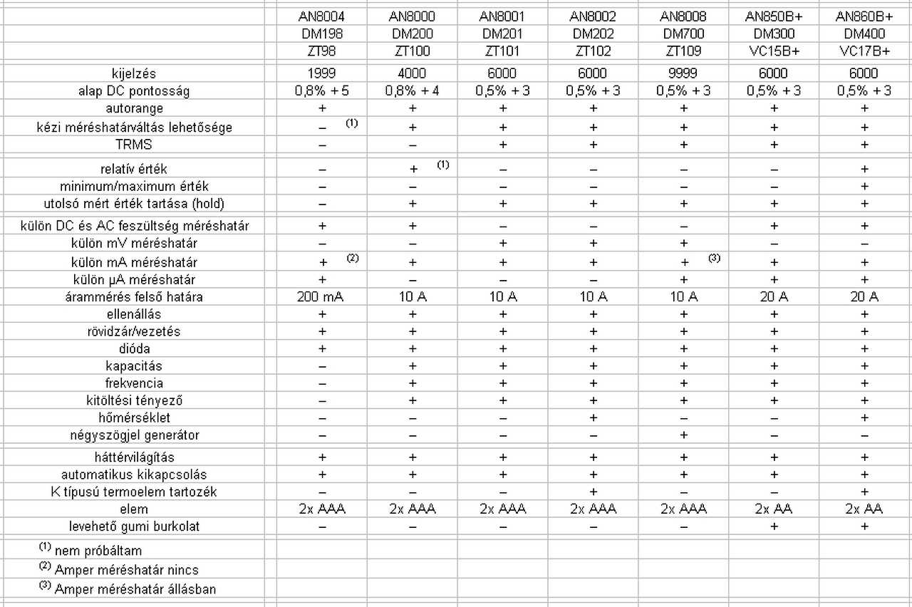 Ilyenket nem részleteztem, hogy hány megaohm vagy hány megahertz a felső határ, egyrészt mert 10 mega felett egyiknek sincs hobbi használat mellett jelentősége, másrészt egyes modellek éppen túlteljesítik a specifikációt. Nem saját megfigyelés, de több internetes oldalon állítják, hogy a DMM chip (a 1999 változatokat leszámítva) ugyanaz mindben, csak a felprogramozás illetve a user interface (= forgókapcsoló) különböző. Orosz szaktársaknak sikerült pl. a 6000 kijelzésű modelleket felhekkelni 9999 kijelzésűre, mint ahogy a dm700-ban is elérhetővé tették a hőmérséklet mérést.