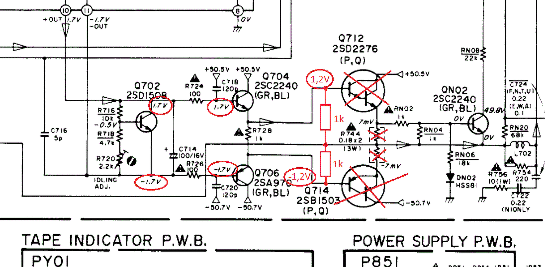 Szia! A mérés előtt szemrevételezzük a végtranzisztor emitter-ellenállásokat, ha égés nyomát látjuk rámérünk 20 %-on belül van-e a tényleges értéke. Az ellenálláslábak beforrasztását átfuttatjuk, ha ki lennének mattulva a melegtől.