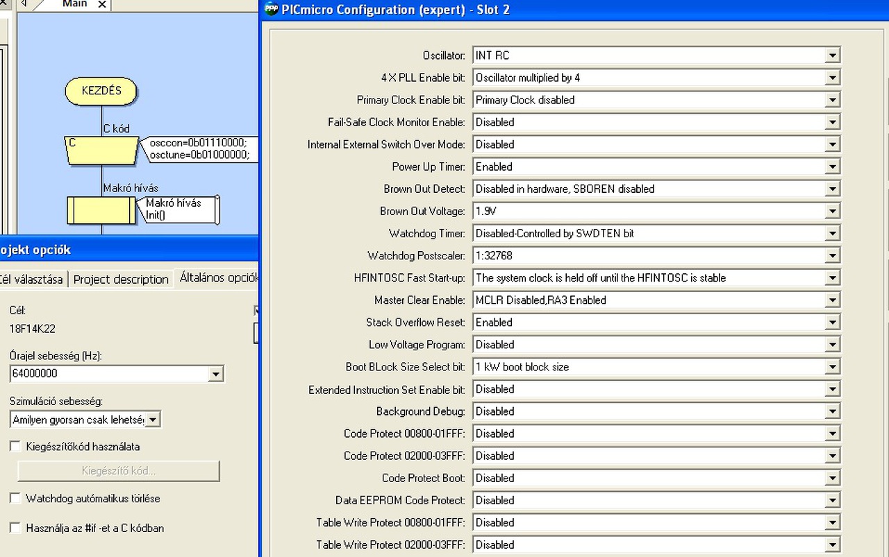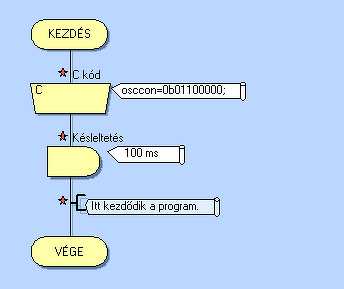 1: kiválasztod, hogy belső vagy külső órajellel akarod hajtani a kontrollert (jelen esetben belső). 2: kiválasztod az adatlap alapján, hogy a lehetőségek közül melyikkel élsz. Én a 8 MHz-et választottam neked. 3: Flowcode -> Build menü -> Projekt opciók... -> Chip beállítása (kipipál) -> Configure chip... Itt megadod a konfigurációt amit szeretnél használni. Ez úgy-ahogy megvan, komolyabb probléma nincs benne. 4: Flowcode -> Build menü -> Projekt opciók... -> Órajel sebessg (Hz): mező. Beírod a 8 MHz-et: 8000000 5: raksz egy C blokkot a program elejére, ezzel a tartalommal: osccon=0b01110000; A részelteket az adatlapban találod az oszcillátor konfigurációnal. Ha nem egyértelmű, lehet kérdezni. 6 opcionális: a C kód után, hacsak valamiért nem kell sietni, érdemes egy kis késletetést rakni. Pl. stabilizálódik a tápfeszültség, észhez tér a panelen lévő többi eszköz, chip újraírásakor segíthet (speciális eset, ezt most ne eröltessük). Ennyi.
