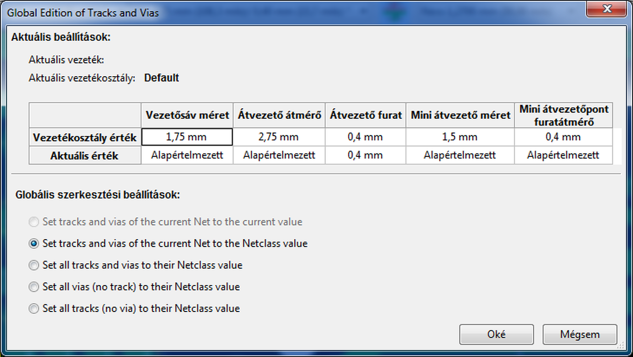 ![]() Tehát Ad2: (hogy megérdemeljem azt a pluszt )"set tracks and vias of the current Net to the Netclass value" "Aktuális Háló vezetősávjának és furatának beállítása a Hálóosztály értékére" Nem túl szép, de magyarul nehéz tömören megfogalmazni. Személy szerint jobban szeretem az angol nyelvet ilyen esetekben.