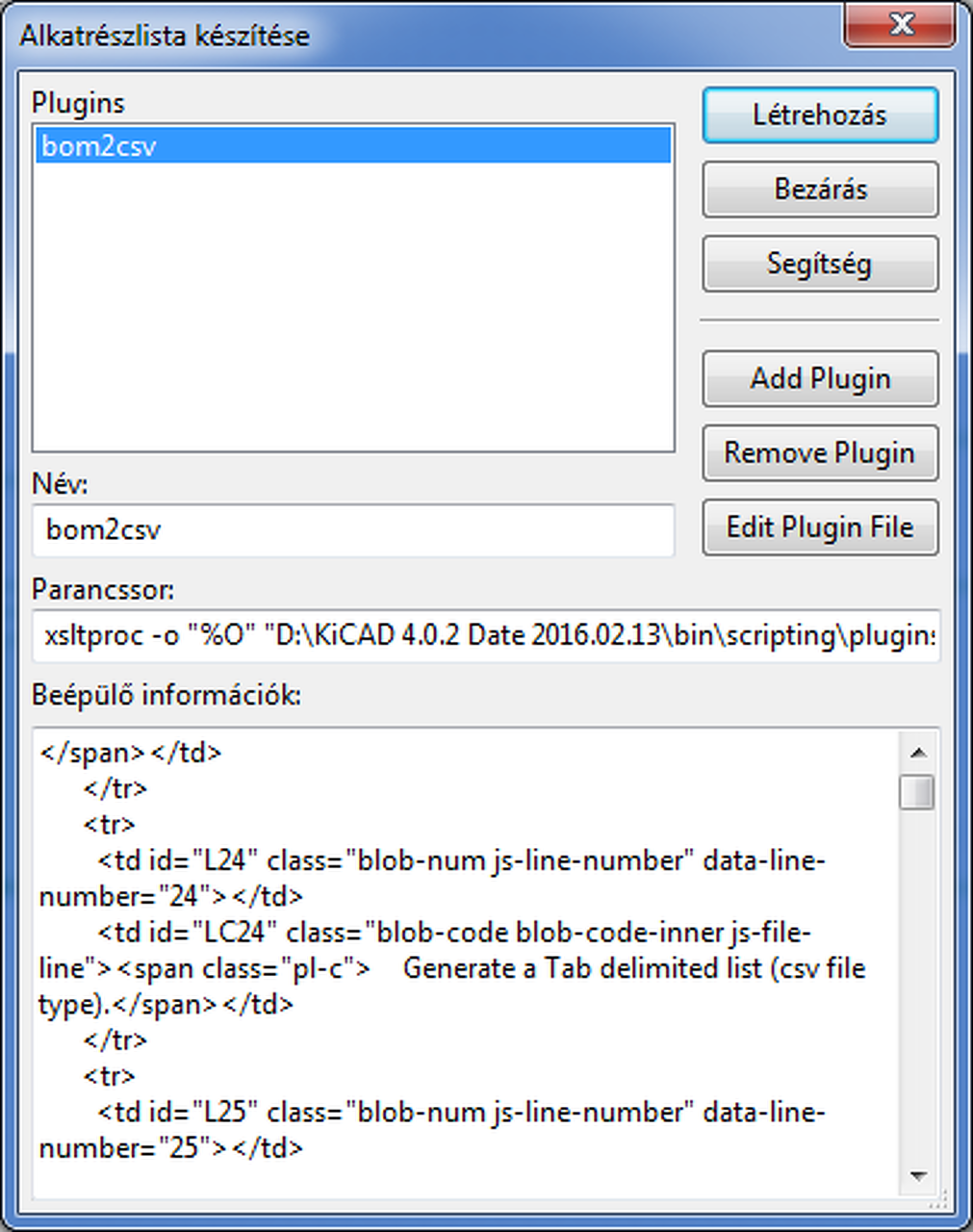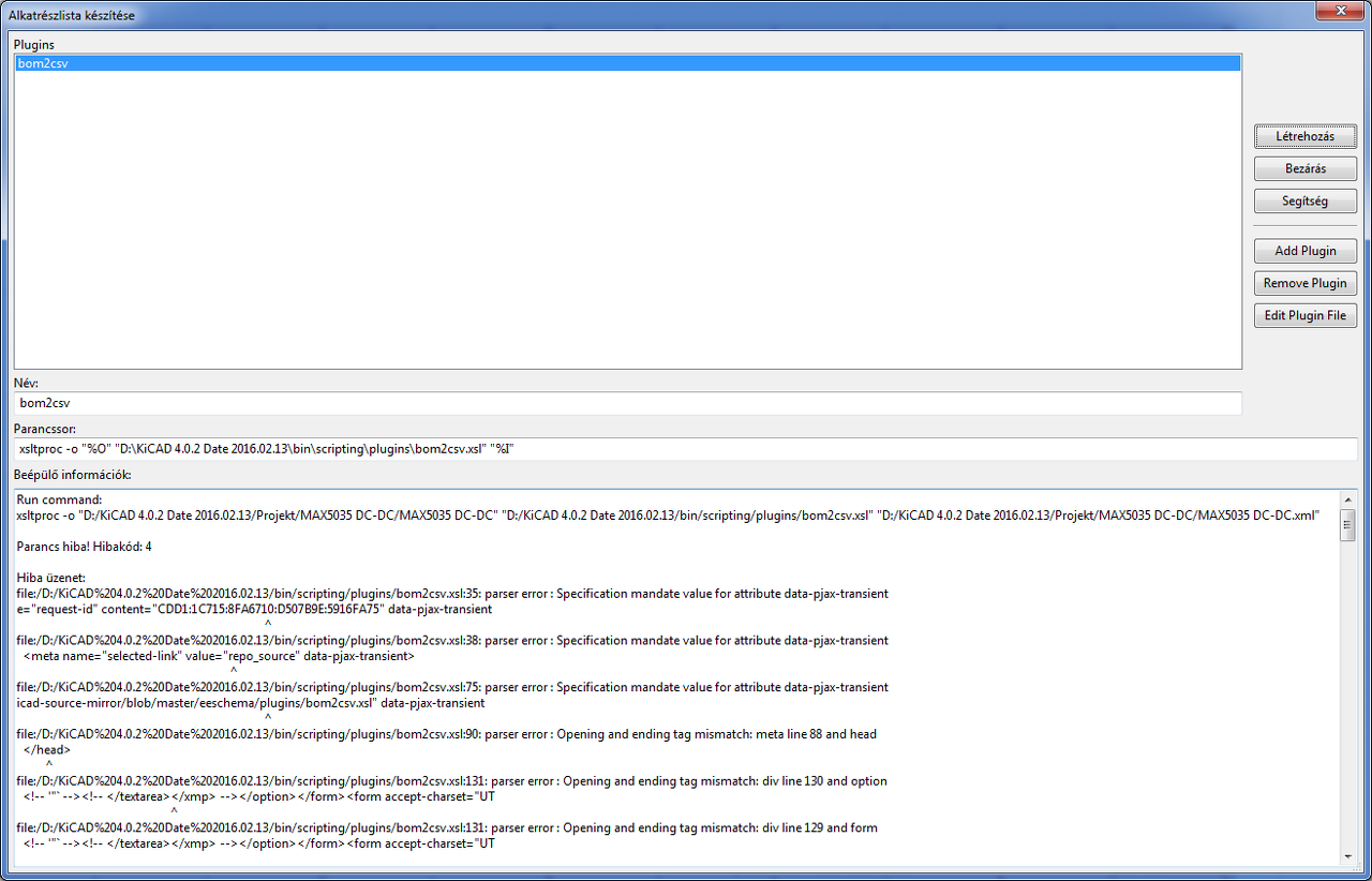 Ha a rajzszerkesztőnél az alkatrészlista készítését választom, és betallózom a bom2csv plugint