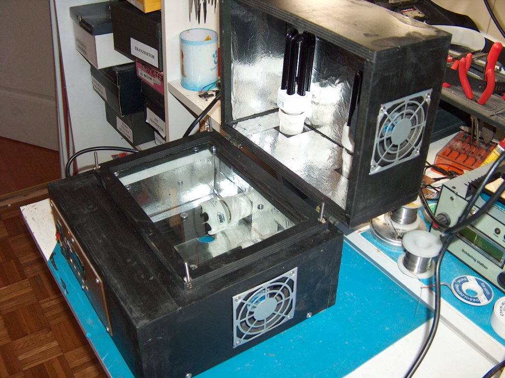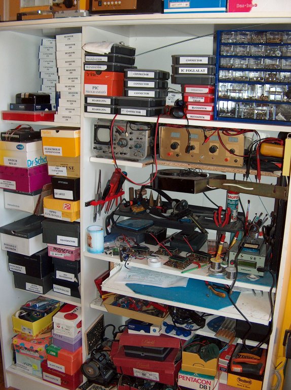Sziasztok! Vettem egy mély levegőt és úgy gondoltam, "elborzasztásul" én is bemutatom a "műhelyem" egy részét. Panelban lakom, így helyszűke miatt egy levehető-tolóajtós szekrényből alakítottam ki, bár kezdem kinőni. Elfér benne egy kisebb alkatrész raktár, a műszerek és kihúzható munkalapján (kalapálás kivételével) lehet dolgozni. Csináltam néhány képet saját készítésű NYÁK levilágítómról, egy NYÁK befogó készülékről, illetve PIC16F88-al vezérelt, MAX6675 hőfokompenzált digitális konverterrel működő forrasztó állomásomról. Remélem a "sufni-tuning" kivitel elnyerte mindenki tetszését.