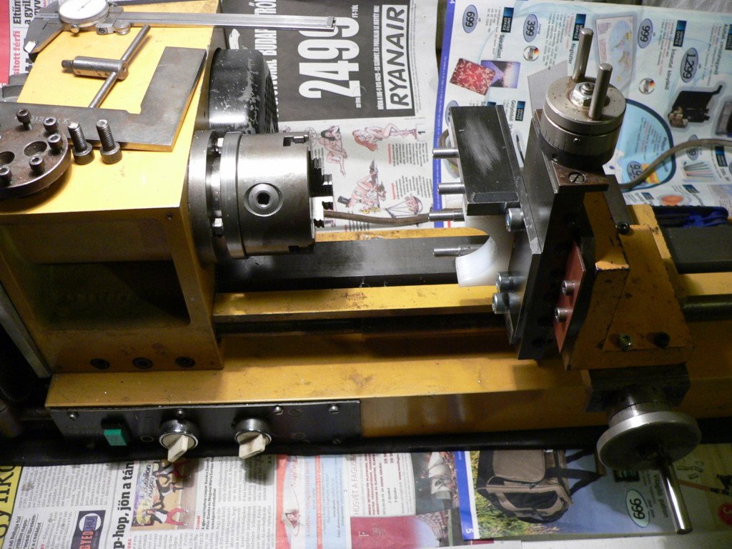 Gyárilag van hozzá egy derékszögű idom, amit a keresztszánra kell rögzíteni, a kéziszánt pedig az idomra lehet szerelni, így áll elő a marógép konfiguráció. Természetesen behatárolt munkaterületű, ~ 100x60mm amit egy felfogásból meg lehet munkálni. A munkadarab rögzítését a kéziszánra a késtartó csavarjainak segítségével, és a mindenkori célnak megfelelő segédeszközökkel kell megoldani- itt tág lehetőséget nyílik a fejvakarásra is...Hogy mi készülget? Egy, (illetve több) speciális munkalámpa, a fiam részére, aki sokallja a gyári árakat-joggal.