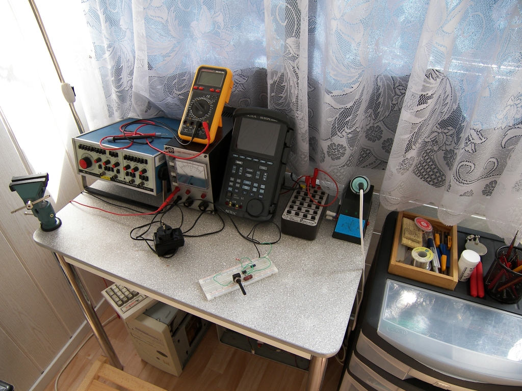 Na akkor én is megmutatom a műhelyem. Kertes ház híján mi beépítettük az erkélyünket, és ott rendezkedtem be. Kérdéseiteket megelőzendő elmondok néhány dolgot. Az asztalon a következő műszerek vannak: függvénygenerátor, tápegység, multiméter, oszcilloszkóp, ellenállásdekád, forrasztópáka. A kis sarokpolc tetején látható tárolórekeszekben tartom az alkatrészeket. A szekrény meg no comment, ott rossz, javítandó készülékektől poliuretán habig minden van. Asztal alatt pedig két számítógép (P1).