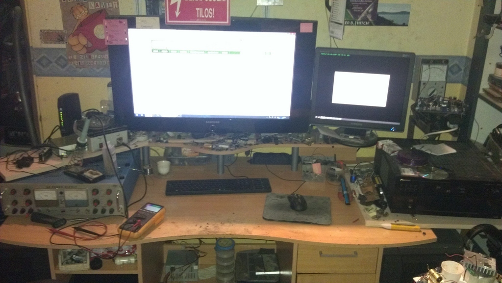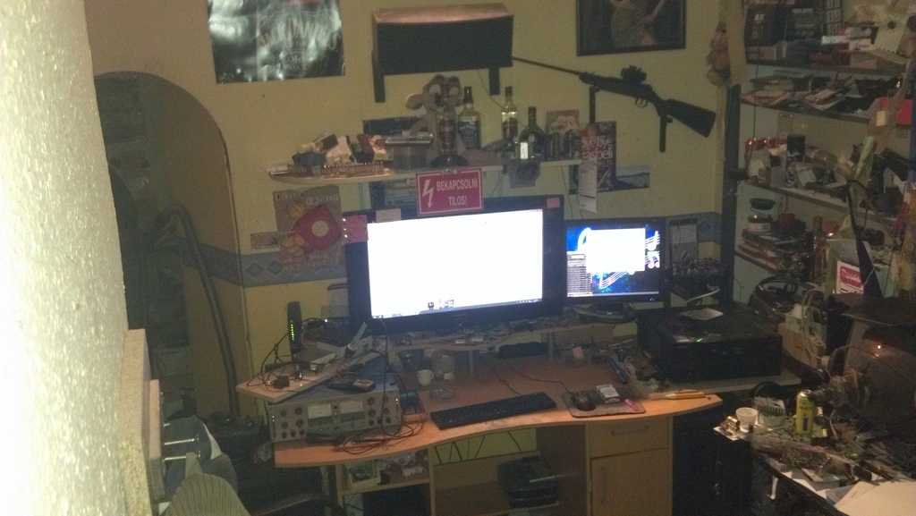 Annyiból magamra ismerek, hogy a nagy asztalon egy tenyérnyi a munkaterület nálam is. Asztal jobb oldalán a fekete doboz mi?