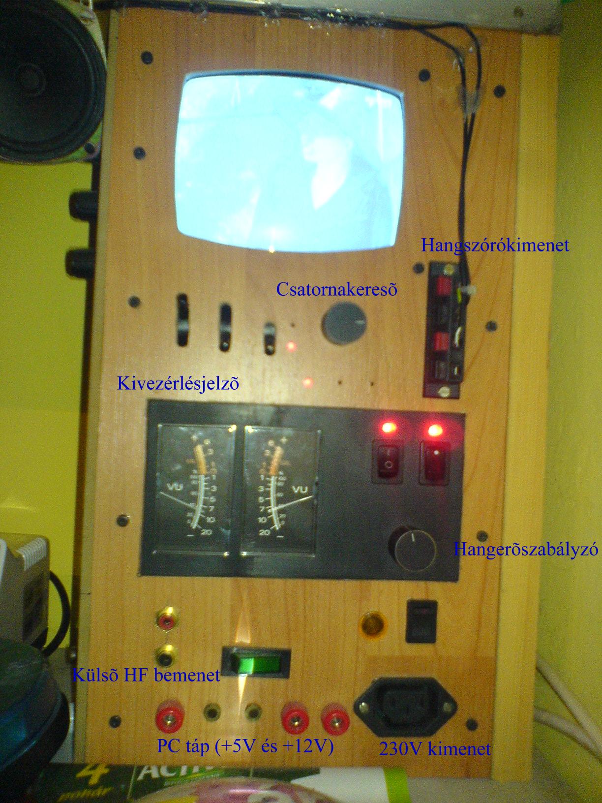 Az a sok kapcsoló! Hát azokkal tudom indítani a levilágítót, a szárítót, egy 1A-es tápegységet, asztalvilágítást, meg a két konektort alul. Az a kis képernyő! Kinevetsz. Multifinkciós képernyő. Rá van kötve a kábeltévé, amire rá-rá pillantok, ha kedvem van. Ha kell átkapcsolom külső bemenetre és pl.: videomagnót tudok rajta vizsgálni. Ezen a panelon kapott helyet egy kisteljesítményű erősítő kivezérlésmérővel, és egy számítógéptáp +5V és +12V-os kimenetei.