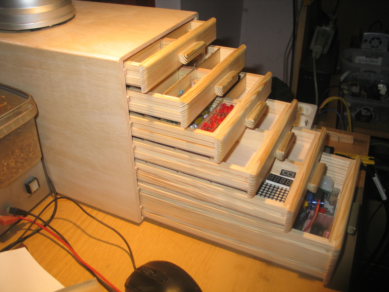 Had dicsekedjek egy kicsit ![]() Tegnap új lakó került az elektromos műhelyembe, - köszönet Alkotó társunknak - egy nagyon jó és praktikus alkatrésztároló szekrényke személyében. Már ideje volt a cserének, mert a réginek a fiókjait a nap megette, és amúgy is kevés volt benne a hely. Most még sok az üres rekesz, csak az ellenállásokat sikerült áttelepítenem a régiből, de lassan megtelik lehet, hogy még egy kelleni fog a sok egyéb alkatrészekkel: tranzisztor, kondenzátorok több fajta, Ledek, kijelzők, IC, AVR, PIC, stb. stb... Alkotó nagyon szép precíz munkát végzett, tudom ajánlani mindenkinek.