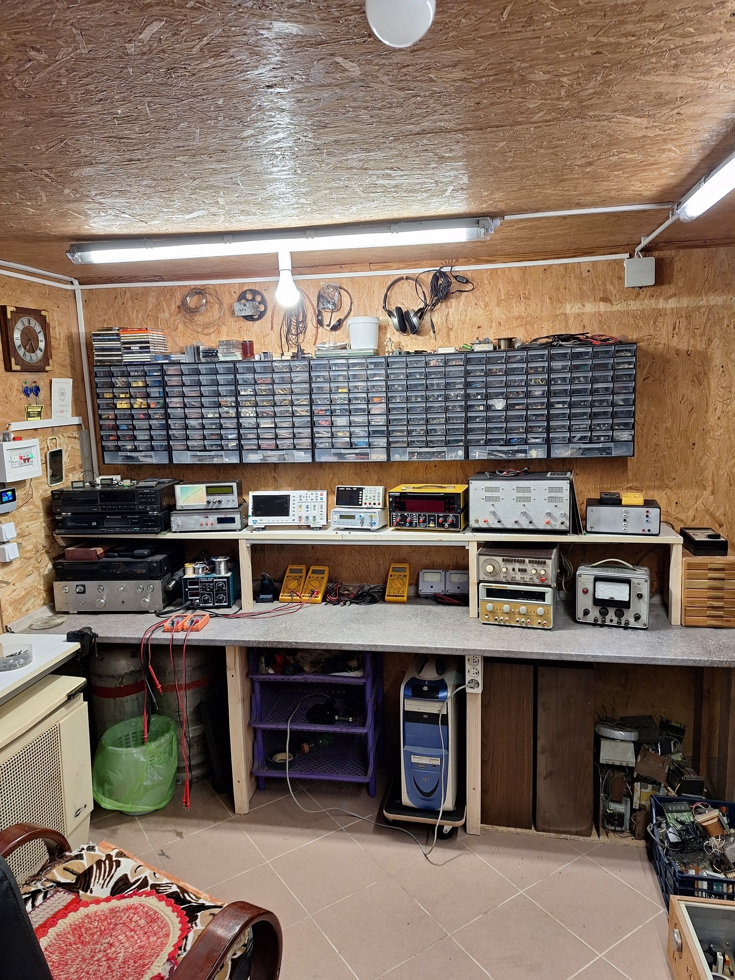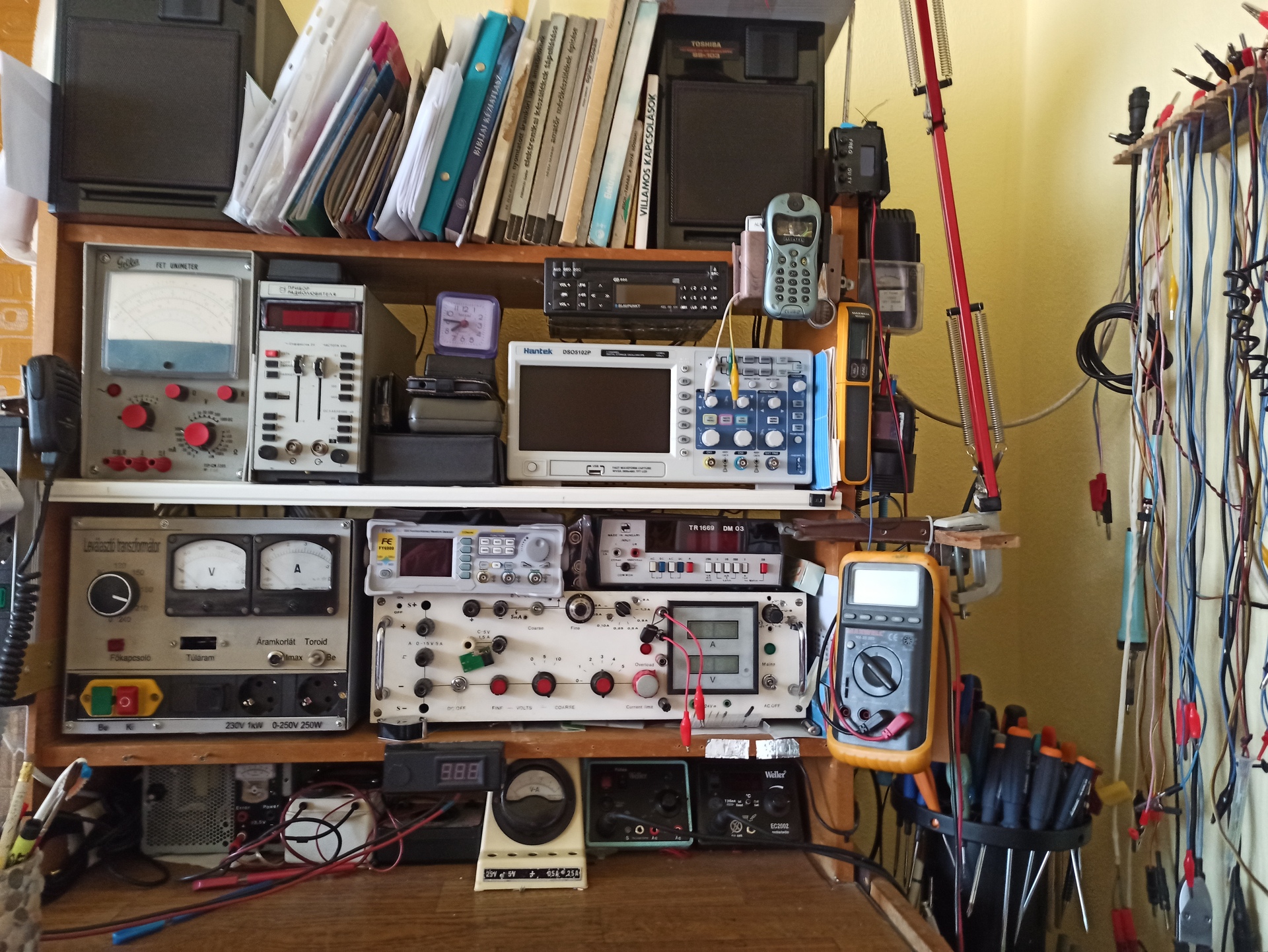 LED világítással, jobbról pedig egy hagyományos búrás lámpa melegfényű, izzólámpát utánzó kivitelű COB-LED-es megvilágítással. Mindkettő állítható karos lámpatest. Ami nem látható a képen, a két alsó polc alsó lapja LED-szalag világítást kapott. Ezek kombinációjával mindig be tudom a feladatnak megfelelően állítani a megfelelő világítást. Egyébként kis méreteknél, IC feliratoknál jobb a hideg fény, nagyobb asztalterületen folyó munkánál természetes fényhez közelítő kevert világítást szoktam használni.