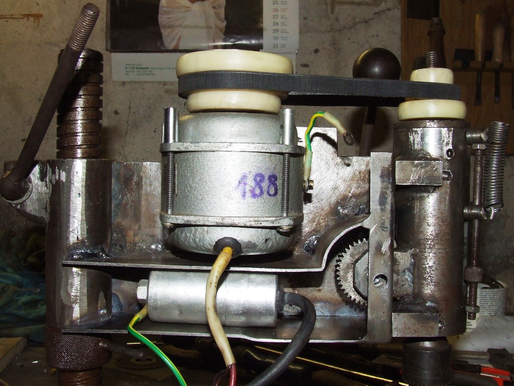 Merevségre teljesen rendben van, pedig csak 2-es lemezből fabrikáltam. A motor lehetne erősebb. A legnagyobb fordulatot (4000) csak akkor veszi fel, ha meglököm kézzel, utána már forog rendesen. Tesztelésképpen próbáltam 4-es fúróval nyákot fúrni, de ha csutkára nyomom neki, akkor a középső (3000-es) fordulaton már be tud lassulni. A legkisebb (2000-es) fordulaton simán viszi a 4-es furót. Egyszóval teljesen rendben van, remekül lehet vele nyákot fúrni. Kicsi, csendes, pontos gép lett belőle. Helyi világítás és egy ki/be kapcsoló még dukál hozzá, majd azt is "megteremtem", no és persze jópár kis apróság, mint pl. festés, esetleg egy ügyes kis fúró-asztal, burkolat a laposszíjnak stb.