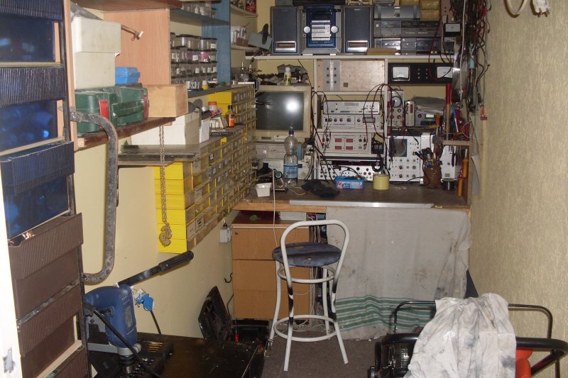 Örülök, hogy él még a téma! Én is közzé teszek két képet a régi műhelyemről. Az egyiken a nagyobbik fiam látható, a másikon én meg a kicsi. (A kicsi az ellenállásaimmal játszik (150 Ohm/0.25W) A rendetlenség csak látszólagos, valóságban kupleráj van a javából. Nemrég költöztem egy másik házba, a régi kisműhelyem 1.5m x 1.8m, ráadásul tetőtérben. Ha lesz kép a másikról (és be is rendeztem), majd teszek fel képeket. Üdv.