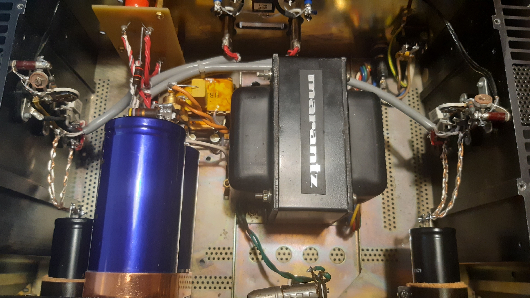 Biztos jobb lett, de még mindig nincsenek kihasználva a kondi tulajdonságai. Ez akkor lesz igazán jó, ha a szürke csőben levő két-két fehér- és piros vezetékeket nem oldalra kötöd ( az a végfok? ), hanem közvetlenül a 2,2 mF-os kondikra mész. A mostani elmenő ezüst, meg rézdrót bekötés marad ott, ahol van, az jó.