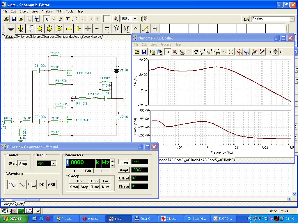 Szevasztok.Oszeraktam ezt az erositot,es mukodik szepen csak az a problemam hogy alapjaratba van egy kis bugasa,ami nagyon zavaro.Az alimentalast az jol megcsinaltam,tetem neki egy 300W-os trafot egy 32A-es graetz hidat,meg ket darab 10000mikros kondit.Foleg akor bug a legjoban mikor bealitom neki a 2.7A-nyugalmi aramot,ugyanis enyit ir elo a raj.A vegfok egyebken+-30V-rol muxik.A parameterei angolul van amit csak nadjabol ertek:Secondary Voltage(Vrms)=30,Supply Rail Voltage(V)=33,Quiesccent Current (A)=2.7,Power 8ohm(W)=60,Power 6ohm(W)=45,Power 4ohm(W)=30.Ha valaki tud angolul,vagy megcsinalta mar ezt a veget irja le nekem ide hogy mit is jelentenek pontosan ezek a parameterek,ja es a velemenyet.Ja es meg valami,a rajzon az R13,R14,R15,R16-os ellenalasok mijen ertekuek kell hogy legyenek pontosan,en ugyanis 0.1ohmos ellenalasokat alkalmaztam oda,a rajzon pedig 100m-el vannak bejelolve.Meg valami:hamikor bealitom a vegnek a 2.7A-es nyugalmi aramot a kozepfeszutseg viszacsoken egy par voltal a plusz agba,de visza tudom alitani a VR1-es(2k)trimerel,ezs normalis igy?.