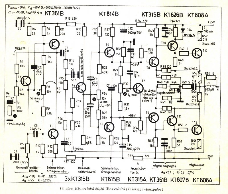 Itt van az Általatok kért Beszpalov-erősítő rajza.Szerintem nem érdemes A osztályú gőzmozdonyokat építeni. Ez a kapcsolás több szempontból sem nevezhető hagyományosnak. Ha mindenképpen A osztályban akarod járatni annak sincs éppen semmi akadálya, csak felesleges. Szerintem 3-500 mA nyugalmi áram több mint elegendő, semmiképpen sem az oszcilloszkópra beállított minimum. Azért ennek is van hibája: nevezetesen , hogy sok a félvezető benne. Bár a három első tranzisztor elhagyható, a következő fokozat erősítésének növelésével.