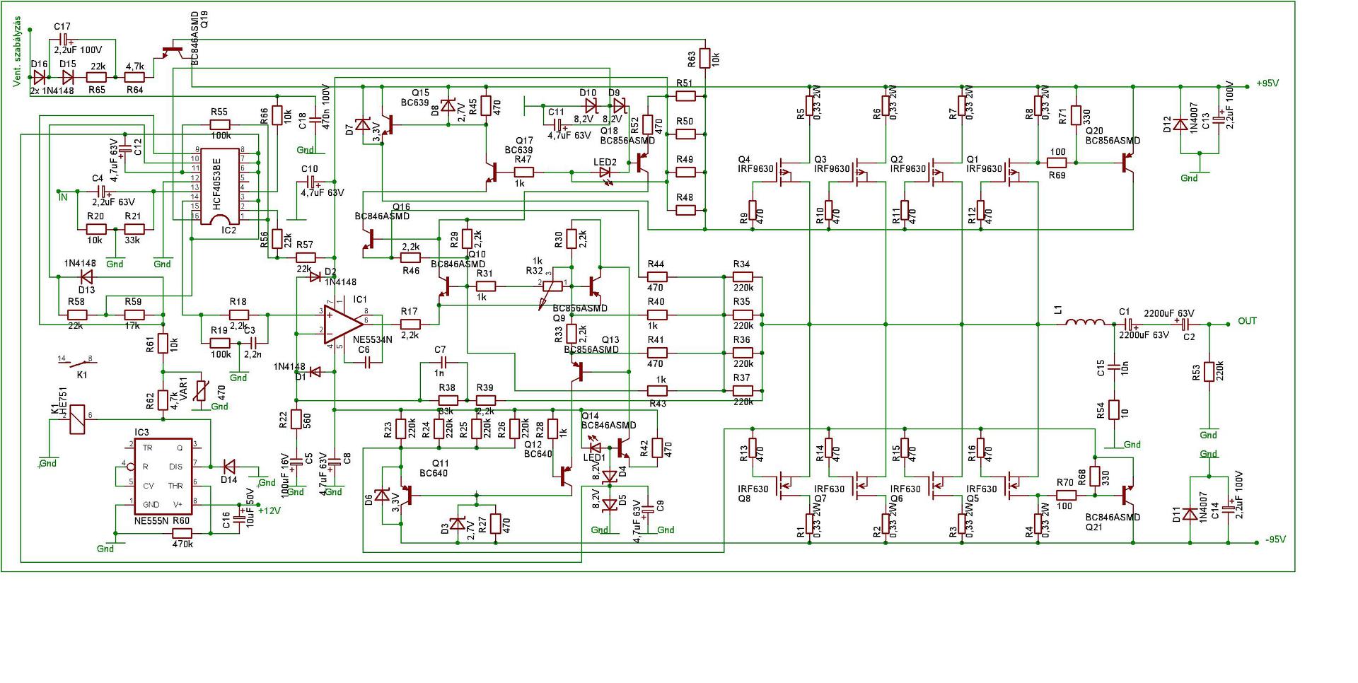 Ez is elfért volna a másik mellett. Ráadásul még a kapcsolási rajzát is mellékelted (ami igencsak hasonlít erre), attól kezdve nem lehet nagy probléma kitalálni, hogy milyen IC -k vannak benne.