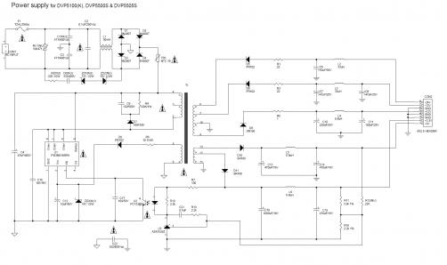 Szerintem első körben nézd meg, hogy a szekunder oldalon az 5V-os táp pufferelkója nem kapacitás-szegény-e. Daewoo DVD-k típushibája volt. Ha minden igaz az egy 1000 mikroF/ 10-25V-os kondi. Érdemes rögtön cserélni. Másodsorban mérd végig az összes szekunder oldali egyenirányító-diódát, hogy nem-e zárlatos valamelyik. Akár az egyik rossz, nem indul a táp. LG DVD-k előforduló hibája. Mérd ki az optocsatolót, és a TL431 zenert, hogy zárlatos-e. Az optocsatoló az a négylábú "izé" a trafó mellett. PC123 LV817 vagy valami NEC márkájú lehet, helyettesíthetőek egymással (tapasztalatom szerint). A TL431 pedig a szekunder oldalon van, az optocsatoló mellett. Ha minden jó, akkor valószínűleg az IC rossz. Mielőtt cseréled, fontos, hogy a pufferelkót süsd ki.Sok sikert a javításhoz.